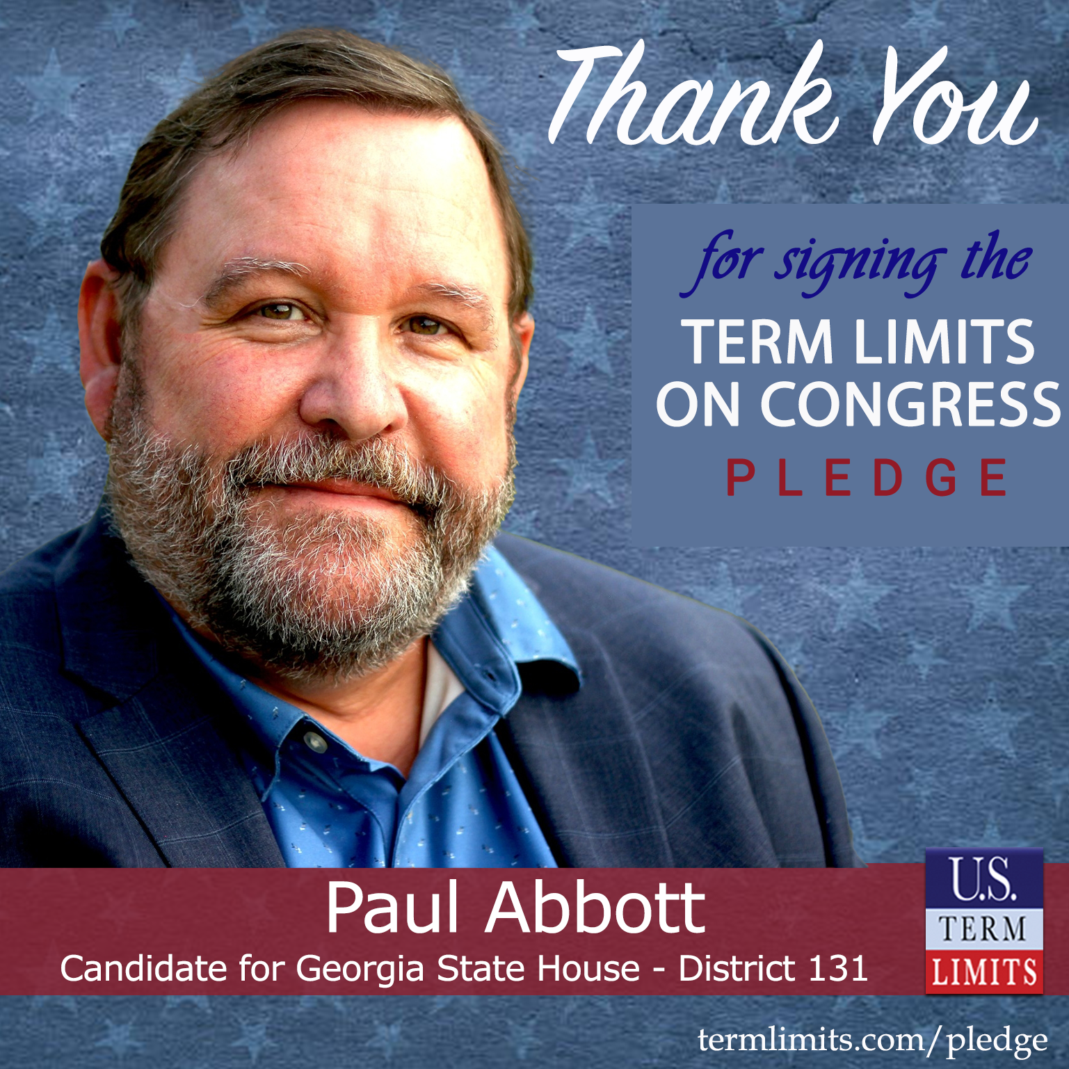 Evans, GA – U.S. Term Limits (USTL), the leader in the national, non-partisan movement to limit terms for elected officials, is gathering support from state lawmakers across the nation. Its mission is to get 34 states to apply for an amendment proposal convention specific to term limits on Congress. Georgia state house candidate, Paul Abbott (District 131), has committed support for term limits on Congress by signing the Term Limits Convention Pledge. Previously, candidates David Byrne and Russell Wilder also signed the pledge.