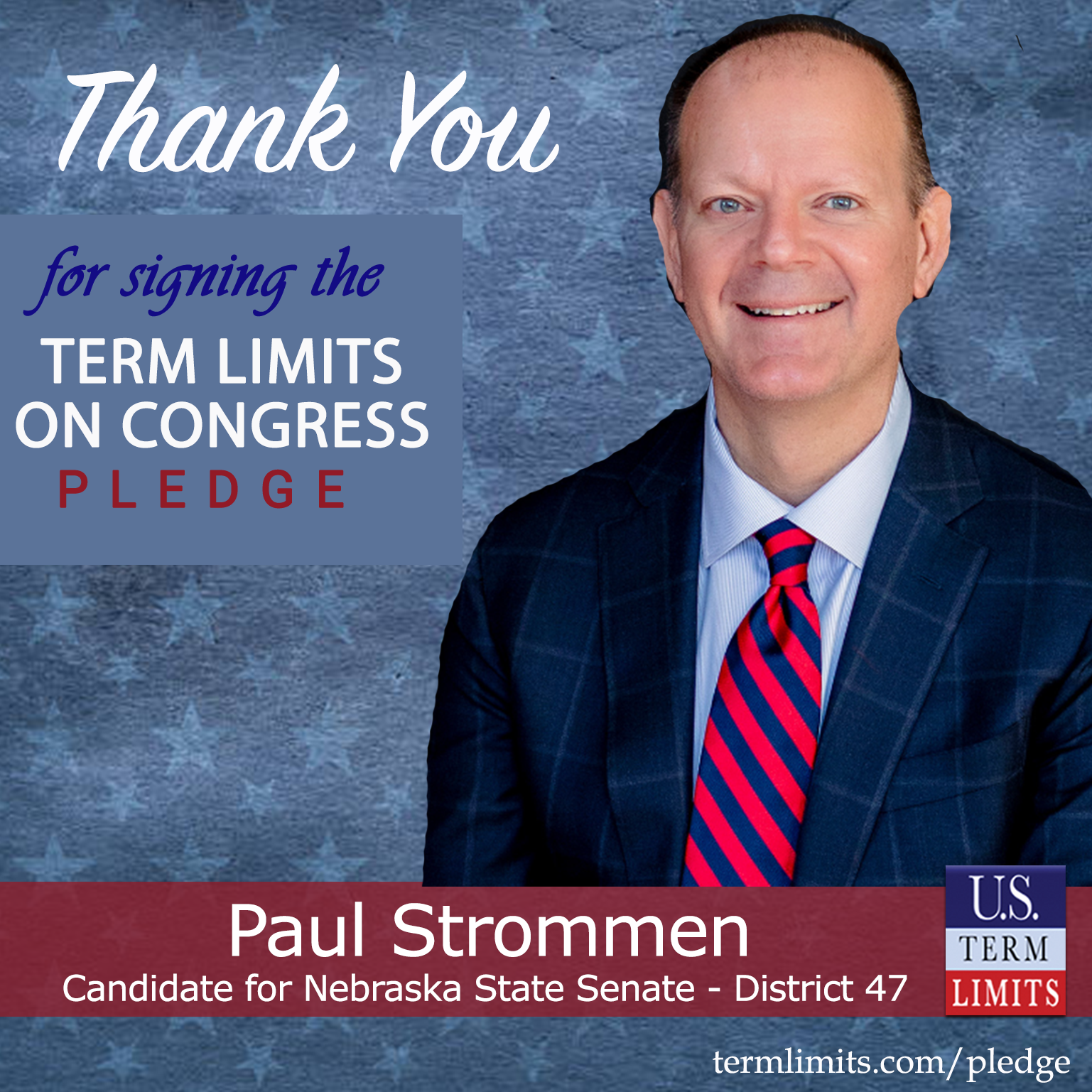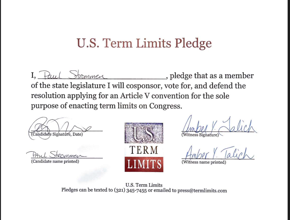 Lincoln, NE – U.S. Term Limits (USTL), the leader in the national, non-partisan movement to limit terms for elected officials, is gathering support from state lawmakers across the nation. Its mission is to get 34 states to apply for an amendment proposal convention specific to term limits on Congress. Nebraska state senate candidate, Paul Strommen (District 47), has committed support for term limits on Congress by signing the term limits convention pledge. Incumbent Senator Erdman and candidate Larry Bolinger have also signed the pledge.