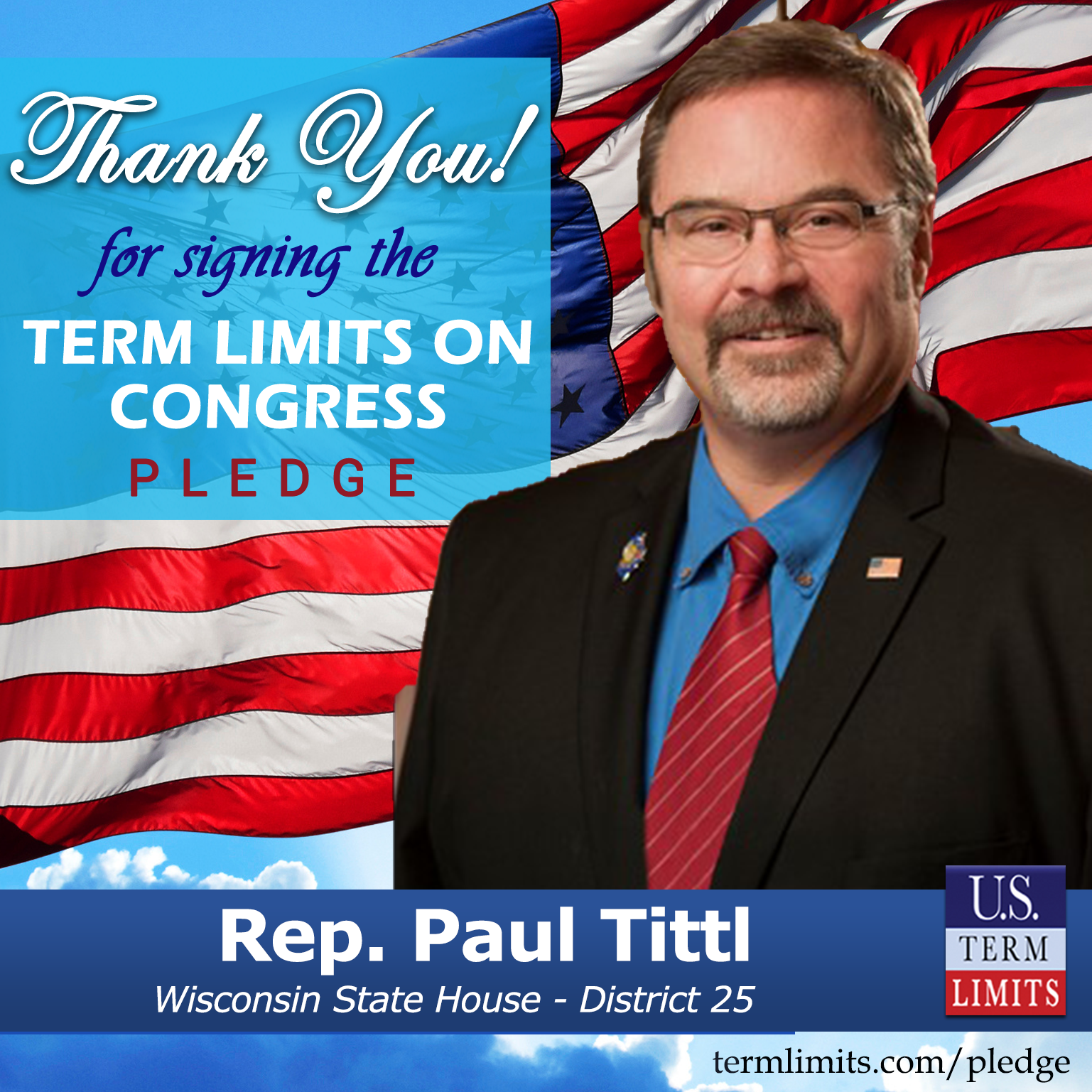 Madison, WI – U.S. Term Limits (USTL), the leader in the national, non-partisan movement to limit terms for elected officials, is gathering support from state lawmakers across the nation. Its mission is to get 34 states to apply for an amendment proposal convention specific to term limits on Congress. Wisconsin state Rep. Paul Tittl (District 25), has committed support for term limits on Congress by signing the term limits convention pledge.