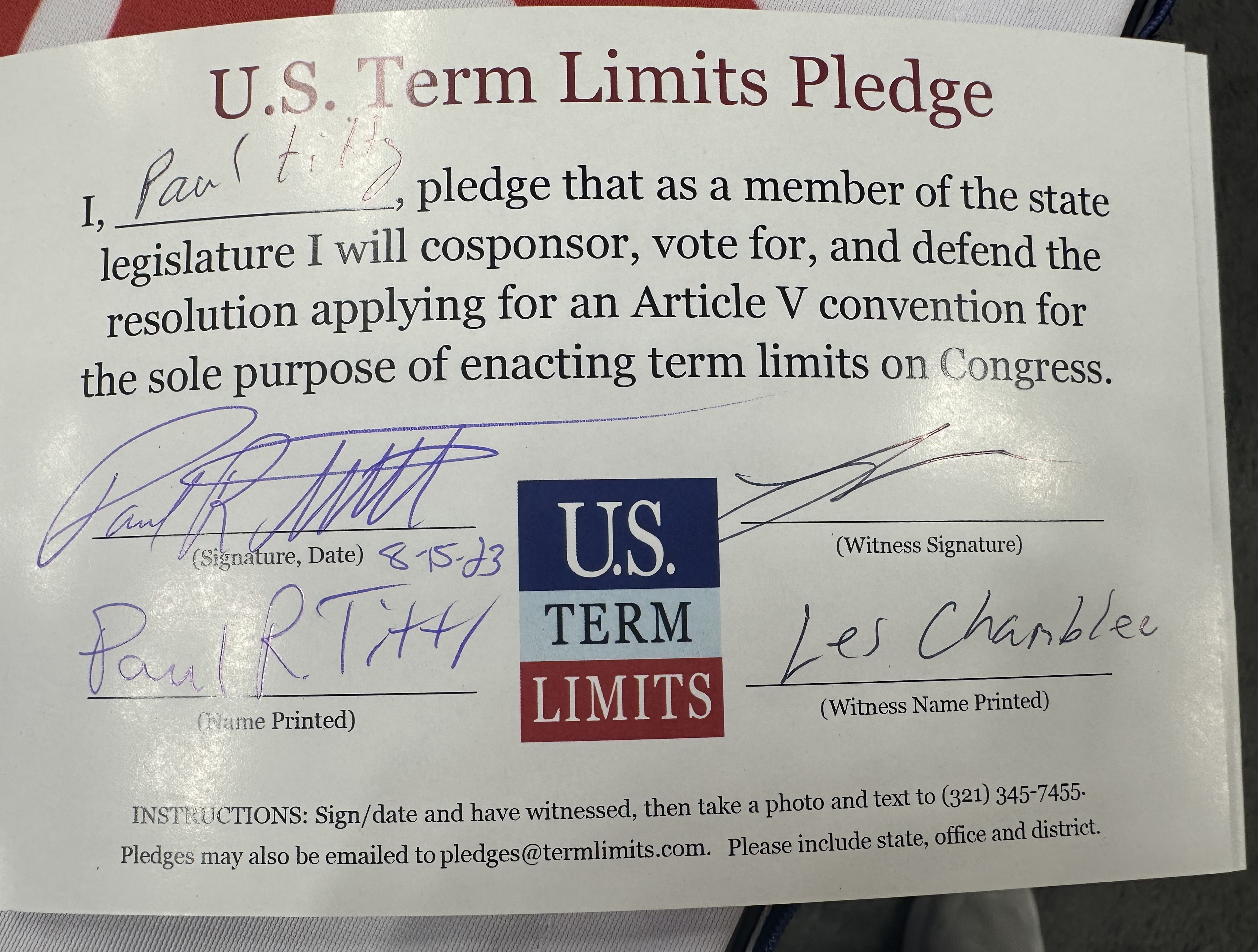 Rep. Paul Tittl Pledges to Support Congressional Term Limits