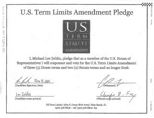 The U.S. Term Limits amendment pledge is provided to every announced candidate for federal office. It reads, “I pledge that as a member of Congress, I will cosponsor and vote for the U.S. Term Limits amendment of three (3) House terms and two (2) Senate terms and no longer limit.” The U.S. Term Limits constitutional amendment has been introduced in both the U.S. Senate by Senator Ted Cruz (SJR1) and the U.S. House by Representative Francis Rooney (HJR20).