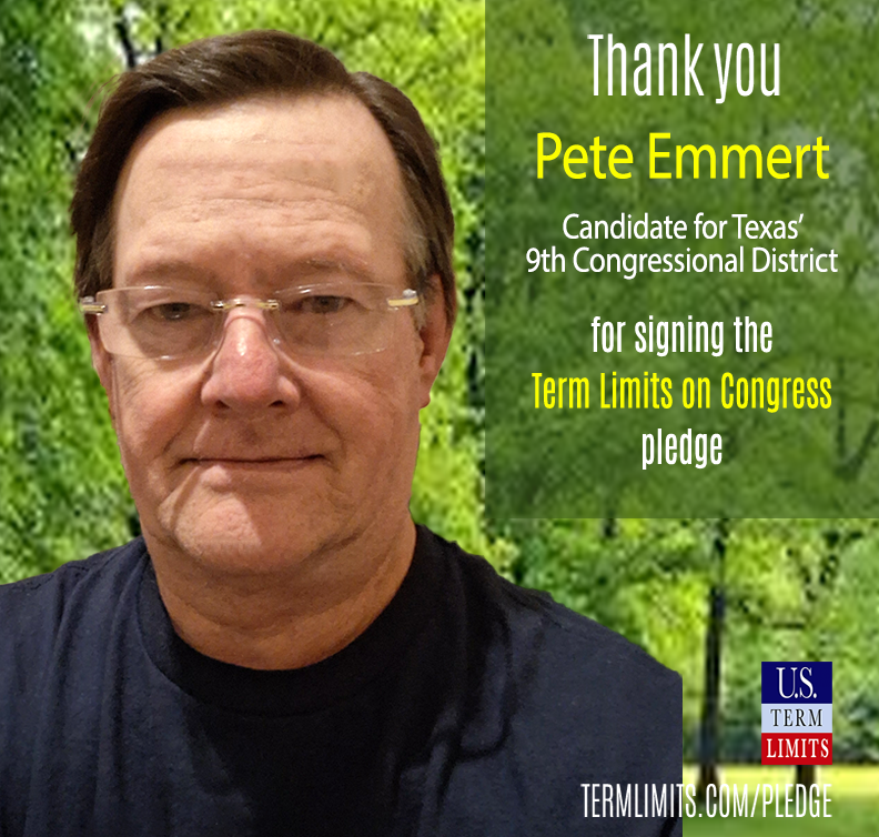 Washington D.C. – U.S. Term Limits (USTL), the leader in the non-partisan national movement to limit terms for elected officials, praises 2026 U.S. House candidate for Texas, Pete Emmert (district 9), for signing the pledge for an amendment to term limit Congress. Previously, candidates Alexandria Butler and Deddrick Wilmer also signed the pledge.