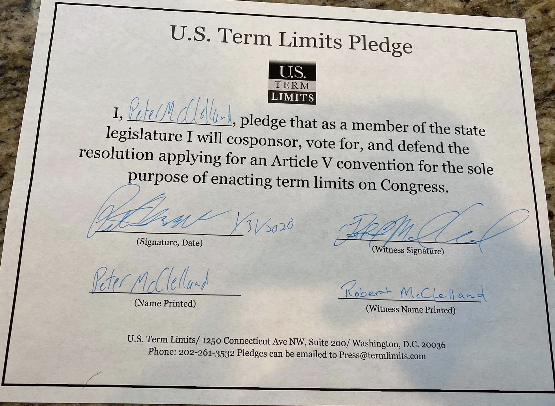 Peter McClelland Pledges to Support Congressional Term Limits