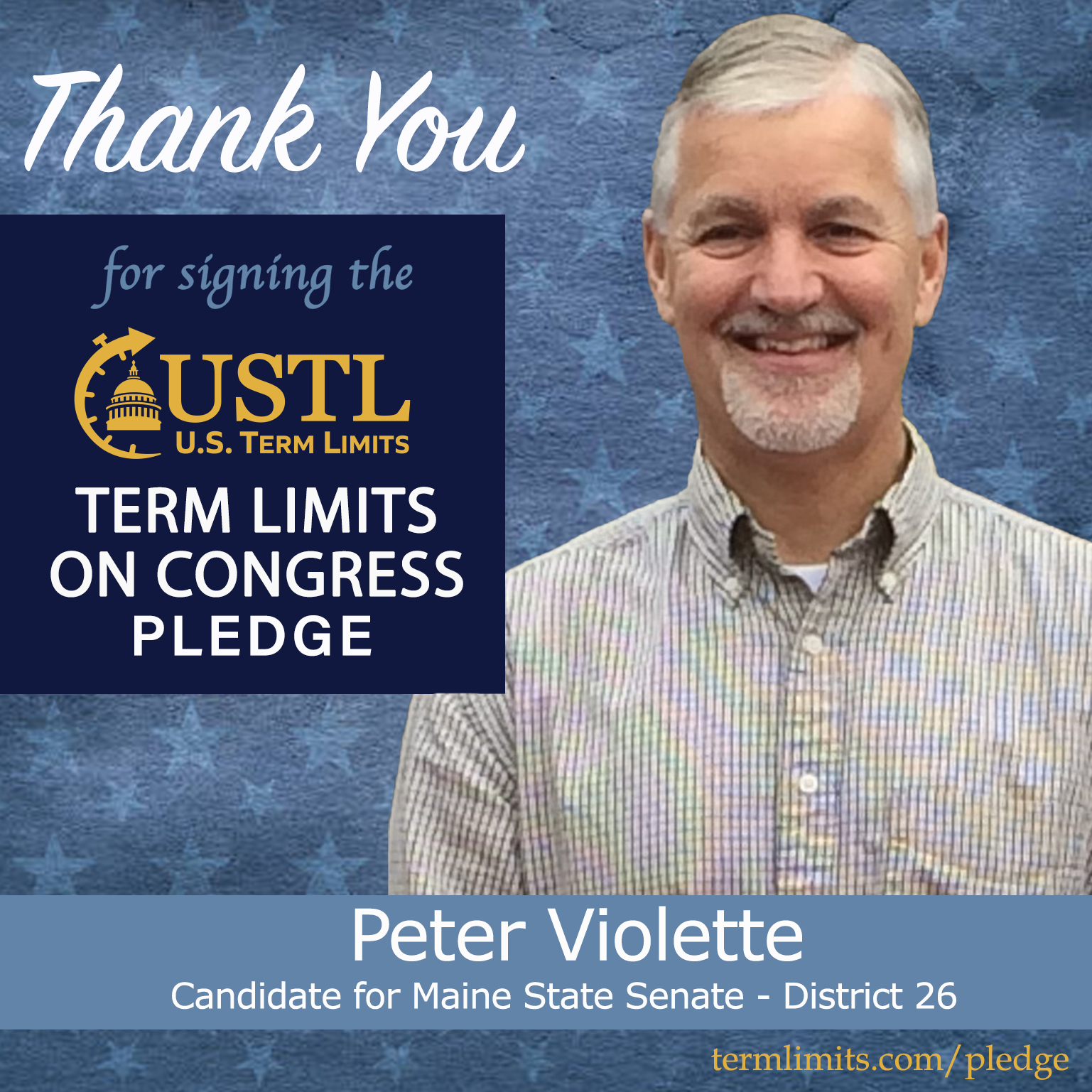 Windham, ME – U.S. Term Limits (USTL), the leader in the national, non-partisan movement to limit terms for elected officials, is gathering support from state lawmakers across the nation. Its mission is to get 34 states to apply for an amendment proposal convention specific to term limits on Congress. Maine state senate candidate, Peter Violette (district 26), has committed support for term limits on Congress by signing the term limits convention pledge.