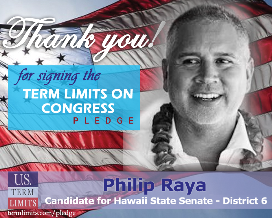 Honolulu, HI– U.S. Term Limits (USTL), the leader in the national, non-partisan movement to limit terms for elected officials, is gathering support from state lawmakers across the nation. Its mission is to get 34 states to apply for an amendment proposal convention specific to term limits on Congress. Hawaii state senate candidate, Philip Raya (district 6), has committed support for term limits on Congress by signing the U.S. Term Limits pledge. Raya is the first signer in this race.