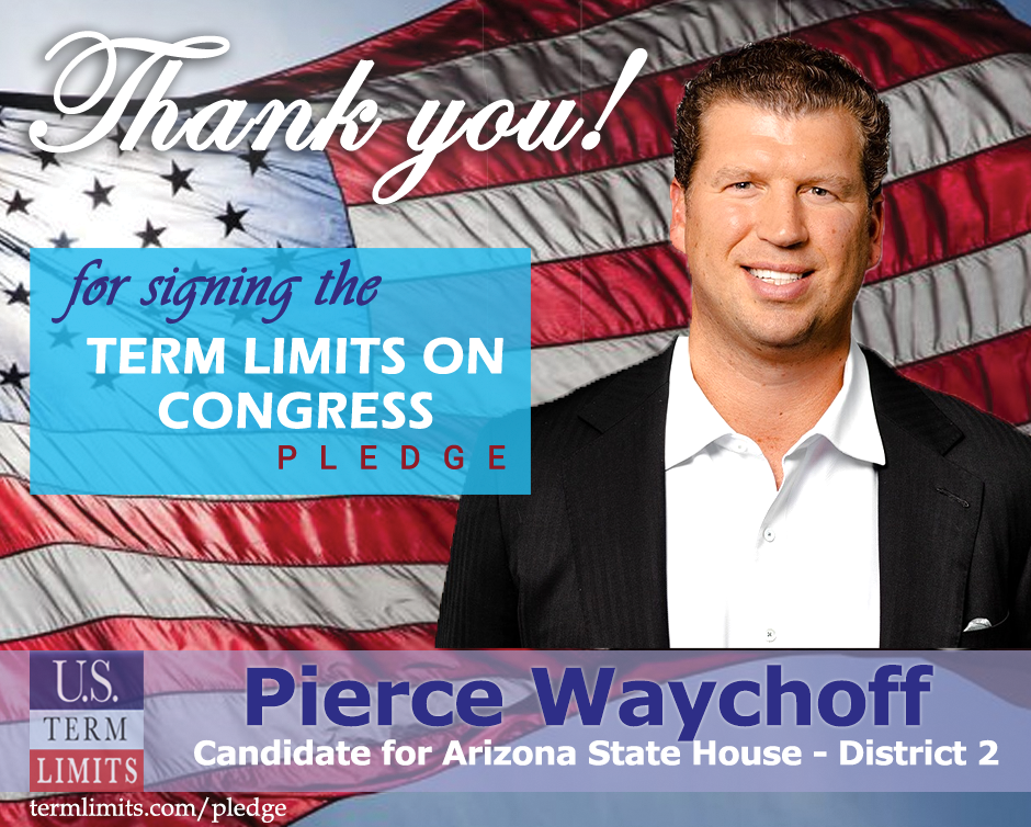Tucson, AZ – U.S. Term Limits (USTL), the leader in the national, non-partisan movement to limit terms for elected officials, is gathering support from state lawmakers across the nation. Its mission is to get 34 states to apply for an amendment proposal convention specific to term limits on Congress. Arizona state house candidate, Pierce Waychoff (district 2) has committed support for term limits on Congress by signing the Term Limits Convention pledge. Waychoff is the first signer in this district.
