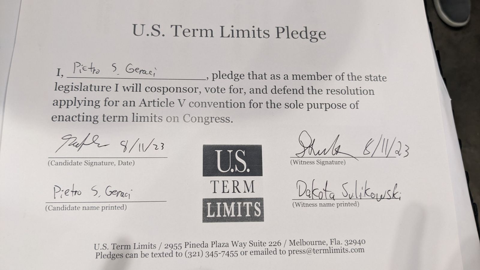 Pietro Geraci Pledges to Support Congressional Term Limits