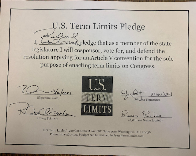 The U.S. Term Limits pledge is provided to candidates and members of state legislatures. It reads, “I pledge that, as a member of the state legislature, I will cosponsor, vote for, and defend the resolution applying for an Article V convention for the limited purpose of enacting term limits on Congress.”