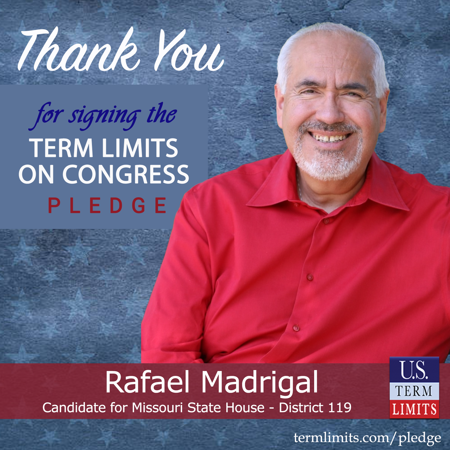Jefferson City, MO– U.S. Term Limits (USTL), the leader in the national, non-partisan movement to limit terms for elected officials, is gathering support from state lawmakers across the nation. Its mission is to get 34 states to apply for an amendment proposal convention specific to term limits on Congress. Missouri state house candidate, Rafael Madrigal (District 119), has committed support for term limits on Congress by signing the Term Limits Convention Pledge.