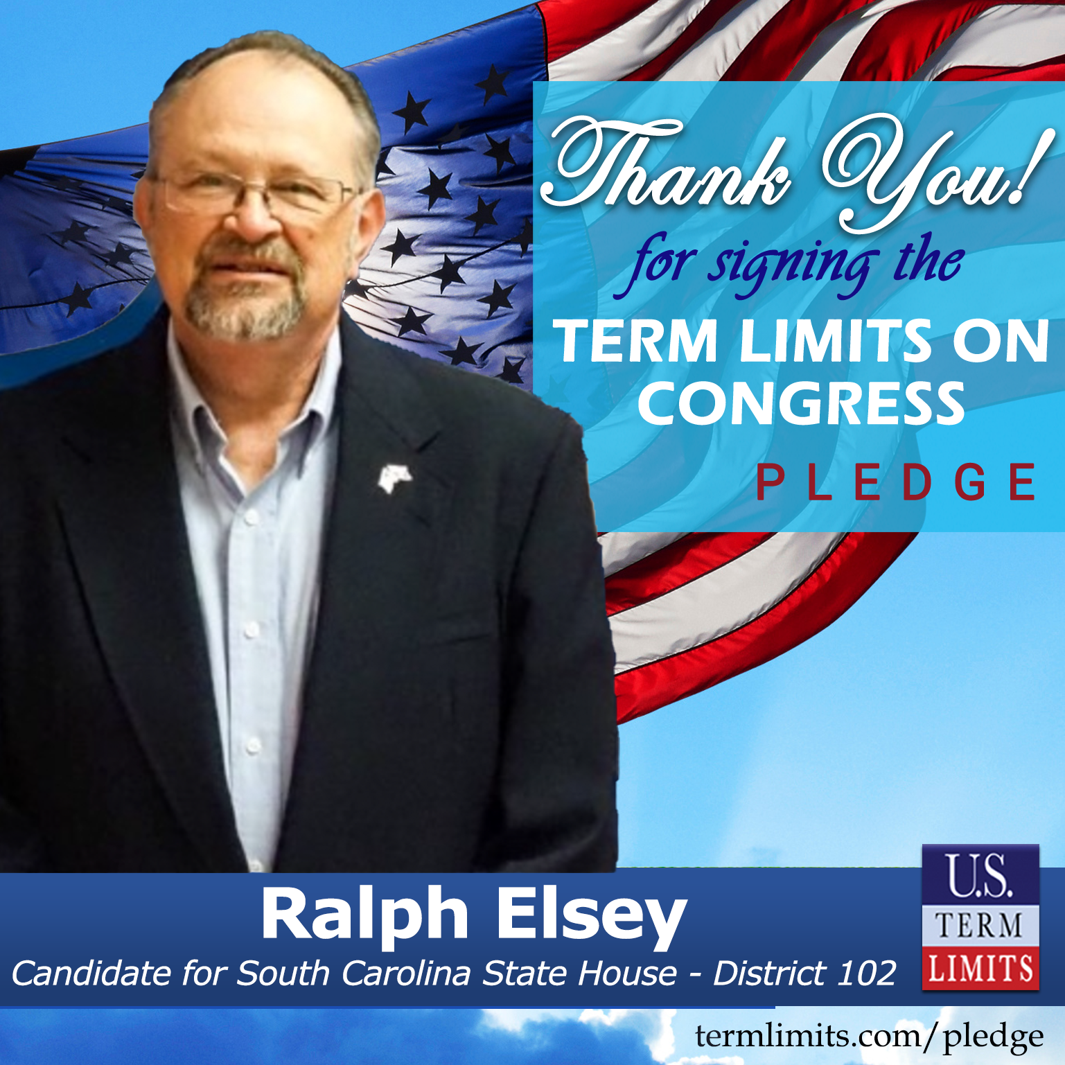 USTL President, Philip Blumel, commented on Elsey’s pledge saying, “Ralph’s strong support of term limits shows that there are individuals who are willing to listen to the majority of voters who want term limits. America needs a Congress that will be served by citizen legislators, not career politicians.”