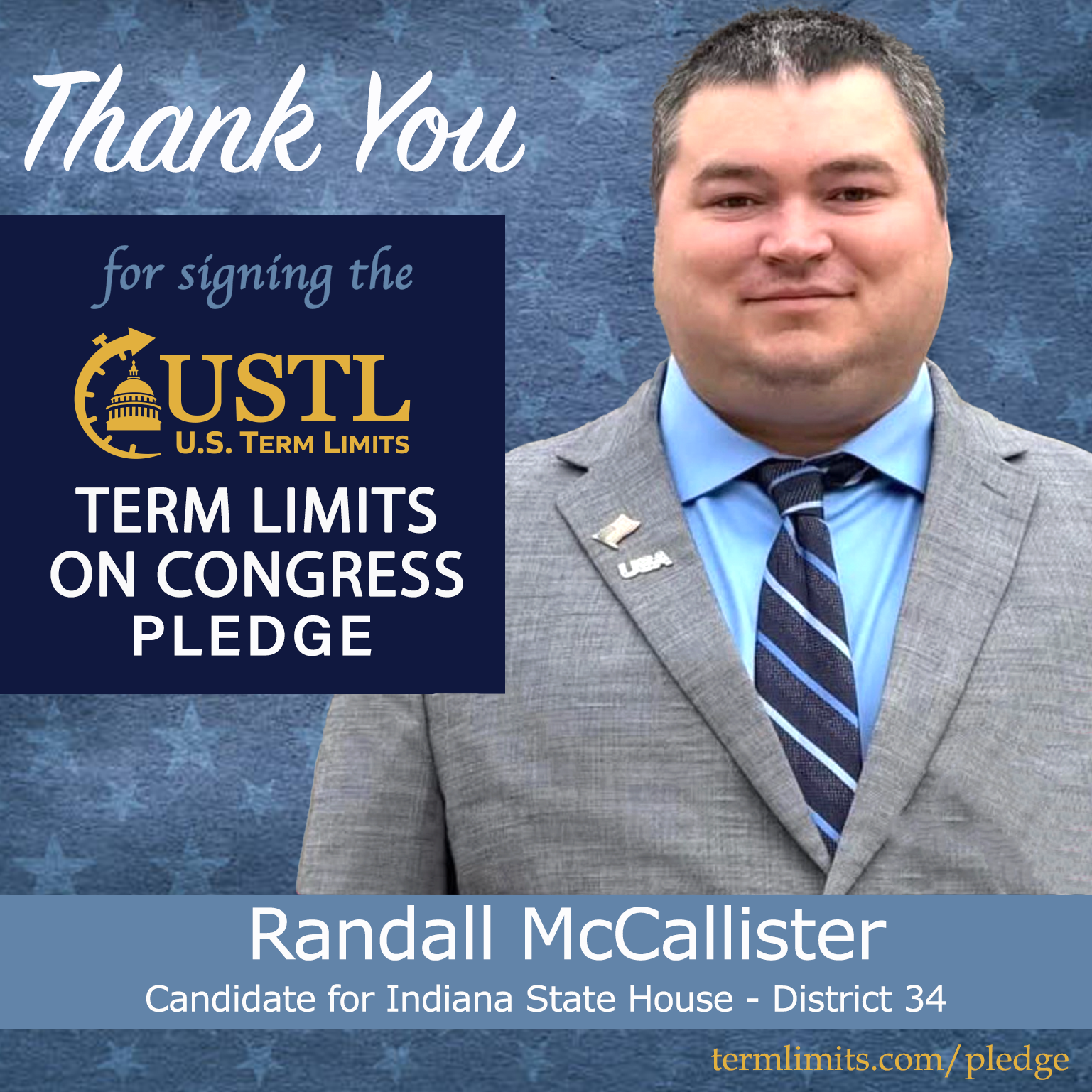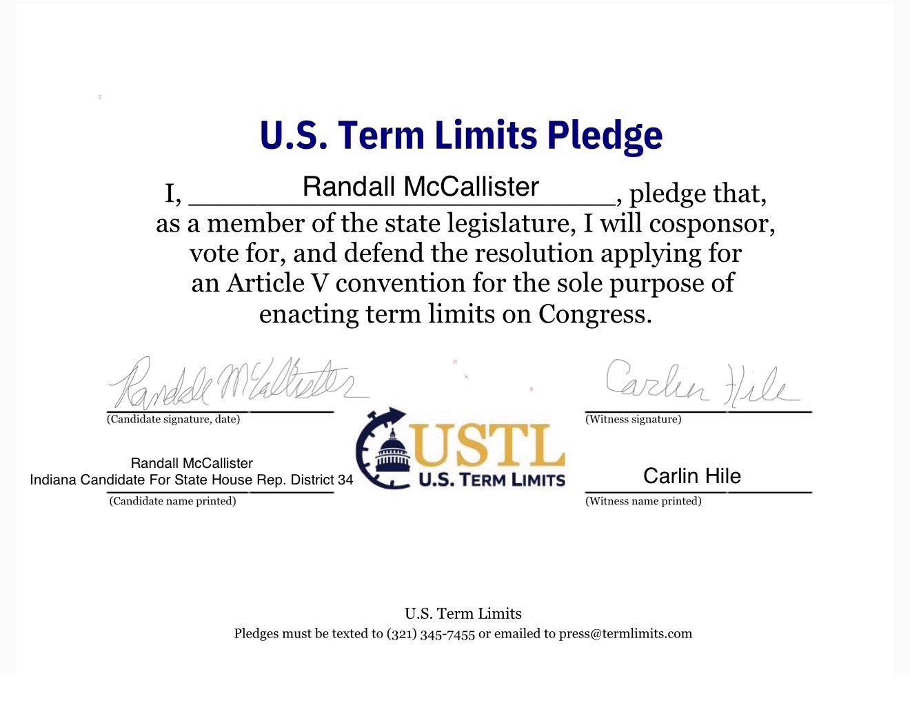 Muncie, IN – U.S. Term Limits (USTL), the leader in the national, non-partisan movement to limit terms for elected officials, is gathering support from state lawmakers across the nation. Its mission is to get 34 states to apply for an amendment proposal convention specific to term limits on Congress. 2026 Indiana state house candidate, Randall McCallister (district 34), has committed support for term limits on Congress by signing the term limits convention pledge.