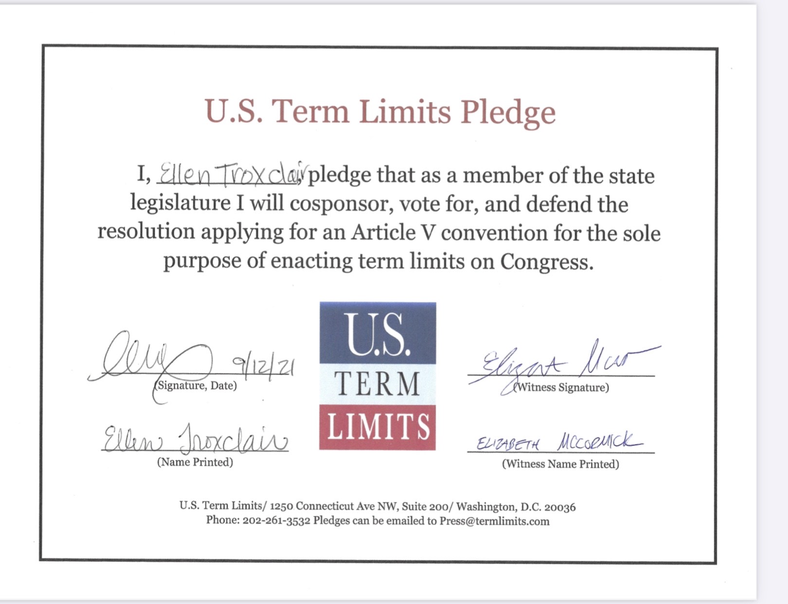 The U.S. Term Limits pledge is provided to candidates and members of state legislatures. It reads, “I pledge that, as a member of the state legislature, I will cosponsor, vote for, and defend the resolution applying for an Article V convention for the limited purpose of enacting term limits on Congress.”