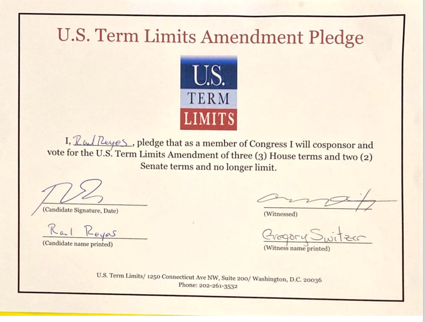 Washington, DC – U.S. Term Limits (USTL), the leader in the non-partisan national movement to limit terms for elected officials, praises 2020 U.S. house candidate for Texas, Raul Reyes (district 23), for signing the pledge for an amendment to term limit Congress. Previously, candidate Tony Gonzales also signed the pledge. The runoff election is scheduled for July 14, 2020.