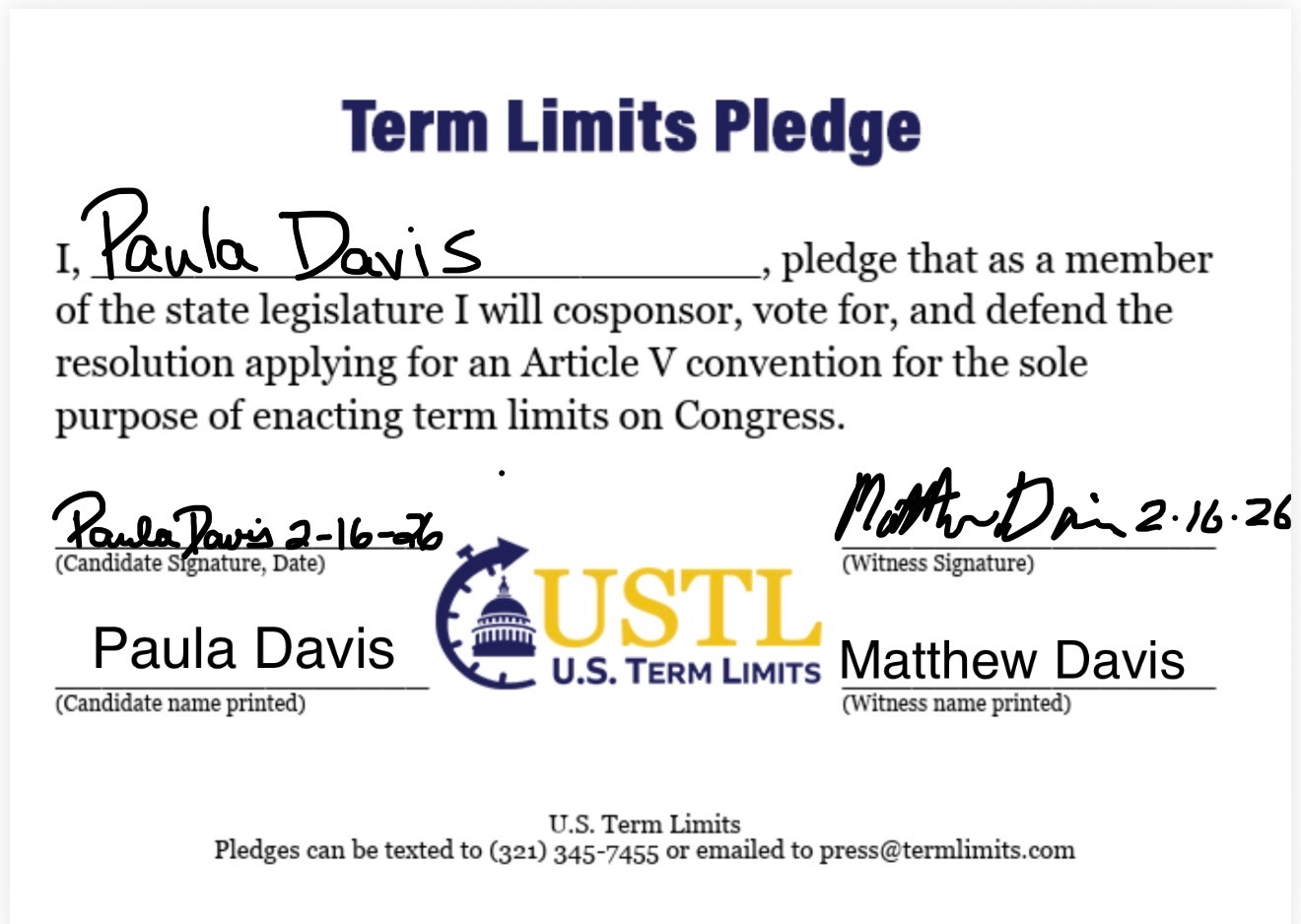 The U.S. Term Limits pledge is provided to candidates and members of state legislatures. It reads, “I pledge that, as a member of the state legislature, I will cosponsor, vote for, and defend the resolution applying for an Article V convention for the sole purpose of enacting term limits on Congress.”