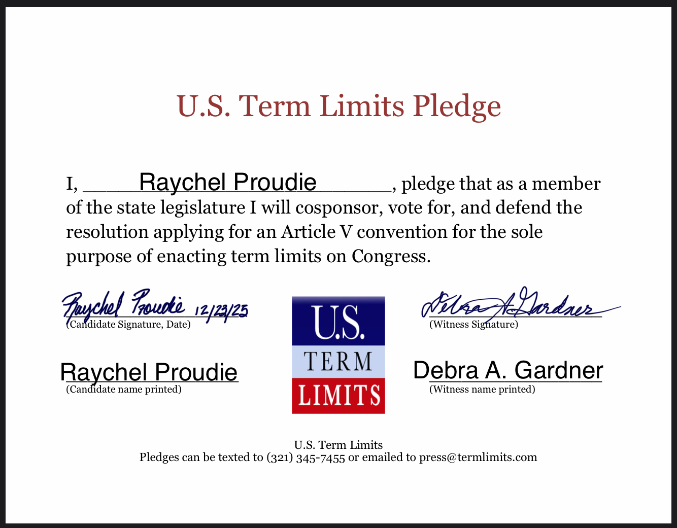 Rep. Raychel Proudie Pledges to Support Congressional Term Limits