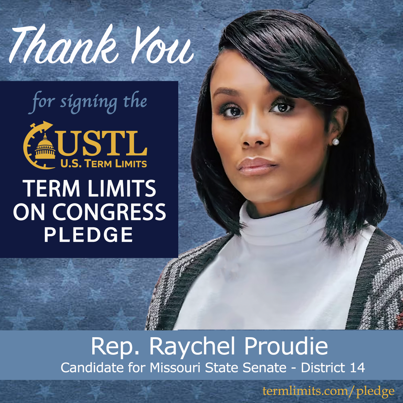Ferguson, MO – U.S. Term Limits (USTL), the leader in the national, non-partisan movement to limit terms for elected officials, is gathering support from state lawmakers across the nation. Its mission is to get 34 states to apply for an amendment proposal convention specific to term limits on Congress. 2025 Missouri state representative (district 73) and state senate candidate (district 14), Raychel Proudie, has committed support for term limits on Congress by signing the term limits convention pledge.
