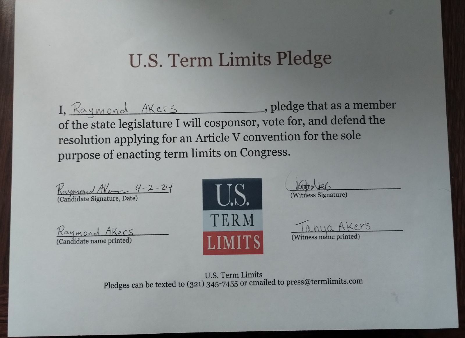 USTL President, Philip Blumel, commented on Akers’s pledge saying, “Raymond’s strong support of term limits shows that there are individuals who are willing to listen to the majority of voters who want term limits. America needs a Congress that will be served by citizen legislators, not career politicians.”