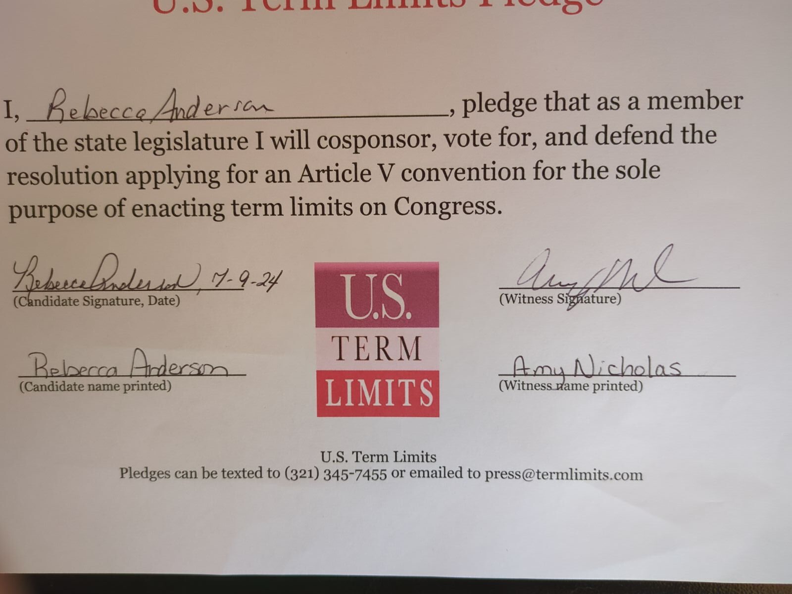 Rebecca Anderson Pledges to Support Congressional Term Limits