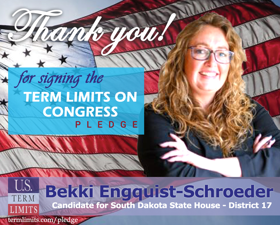 Vermillion, SD – U.S. Term Limits (USTL), the leader in the national, non-partisan movement to limit terms for elected officials, is gathering support from state lawmakers across the nation. Its mission is to get 34 states to apply for an amendment proposal convention specific to term limits on Congress. South Dakota state house candidate, Rebecca Engquist (district 17) has committed support for term limits on Congress by signing the Term Limits Convention pledge.