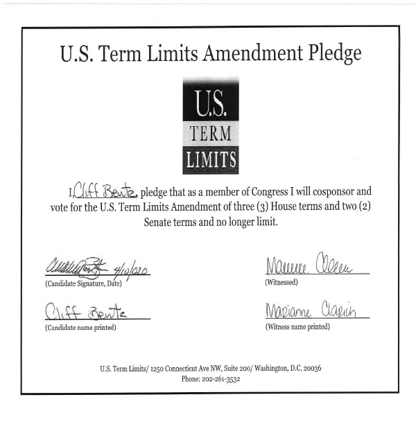 The U.S. Term Limits amendment pledge is provided to every announced candidate for federal office. It reads, “I pledge that as a member of Congress, I will cosponsor and vote for the U.S. Term Limits amendment of three (3) two-year House terms and two (2) six-year Senate terms and no longer limit.”