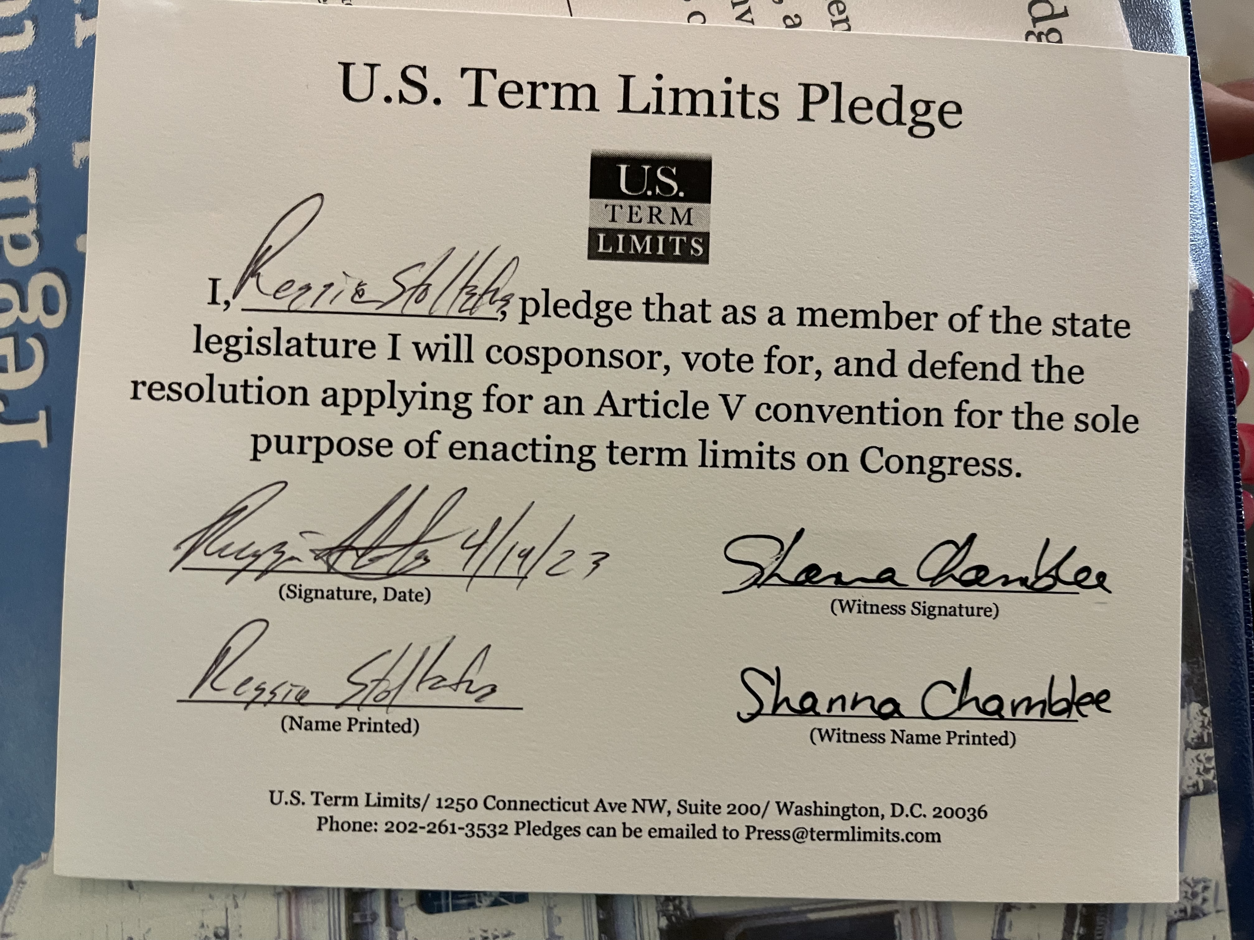 The U.S. Term Limits pledge is provided to candidates and members of state legislatures. It reads, “I pledge that, as a member of the state legislature, I will cosponsor, vote for, and defend the resolution applying for an Article V convention for the limited purpose of enacting term limits on Congress.”