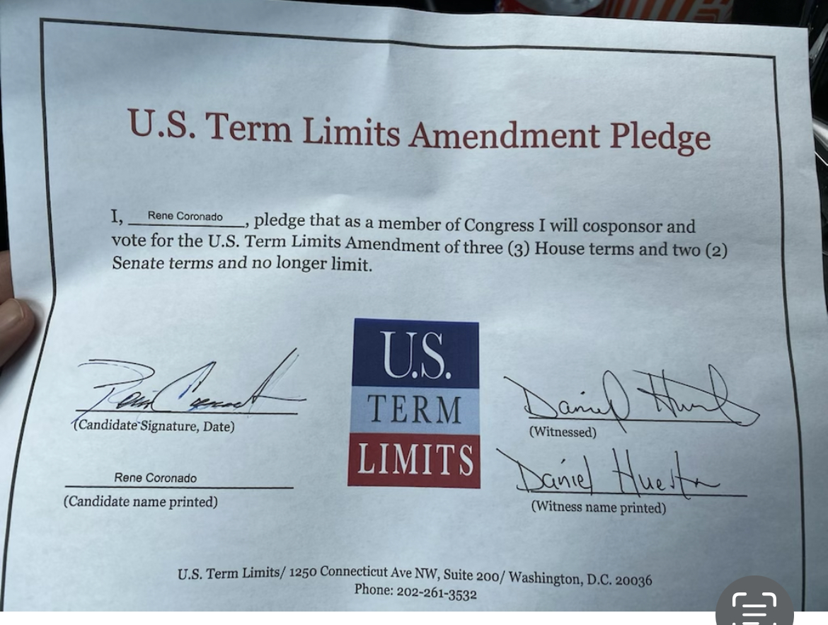 U.S. Term Limits has the support of more than 90 pledge signers in Congress. USTL President Philip Blumel commented on Coronado’s and Flores’s pledges saying, “Rene’s and Mayra’s strong support of term limits shows that there are individuals who are willing to put self-interest aside to follow the will of the people. America needs a Congress that will be served by citizen legislators, not career politicians.”