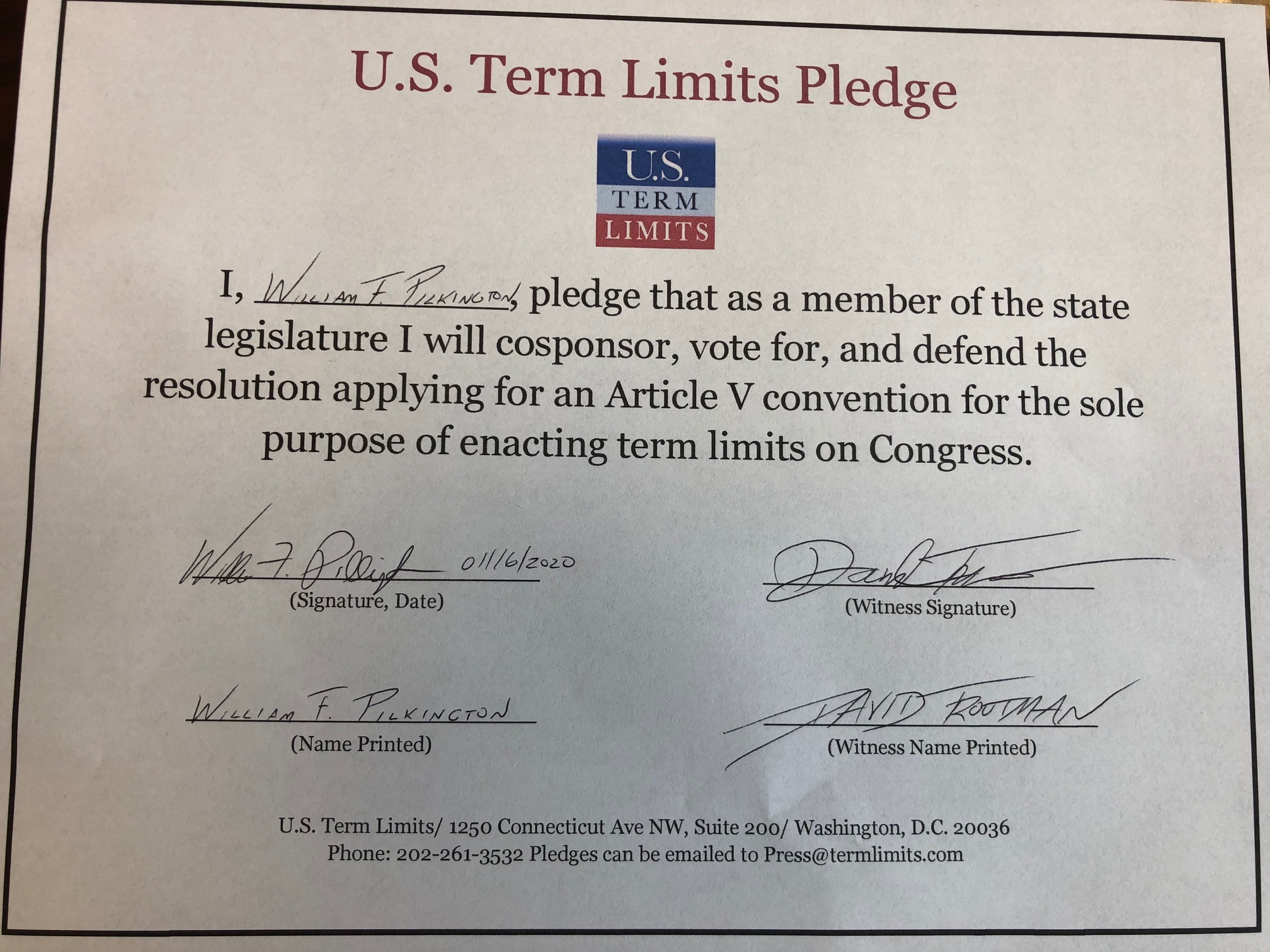 Rep. Aaron Pilkington Pledges to Support Congressional Term Limits