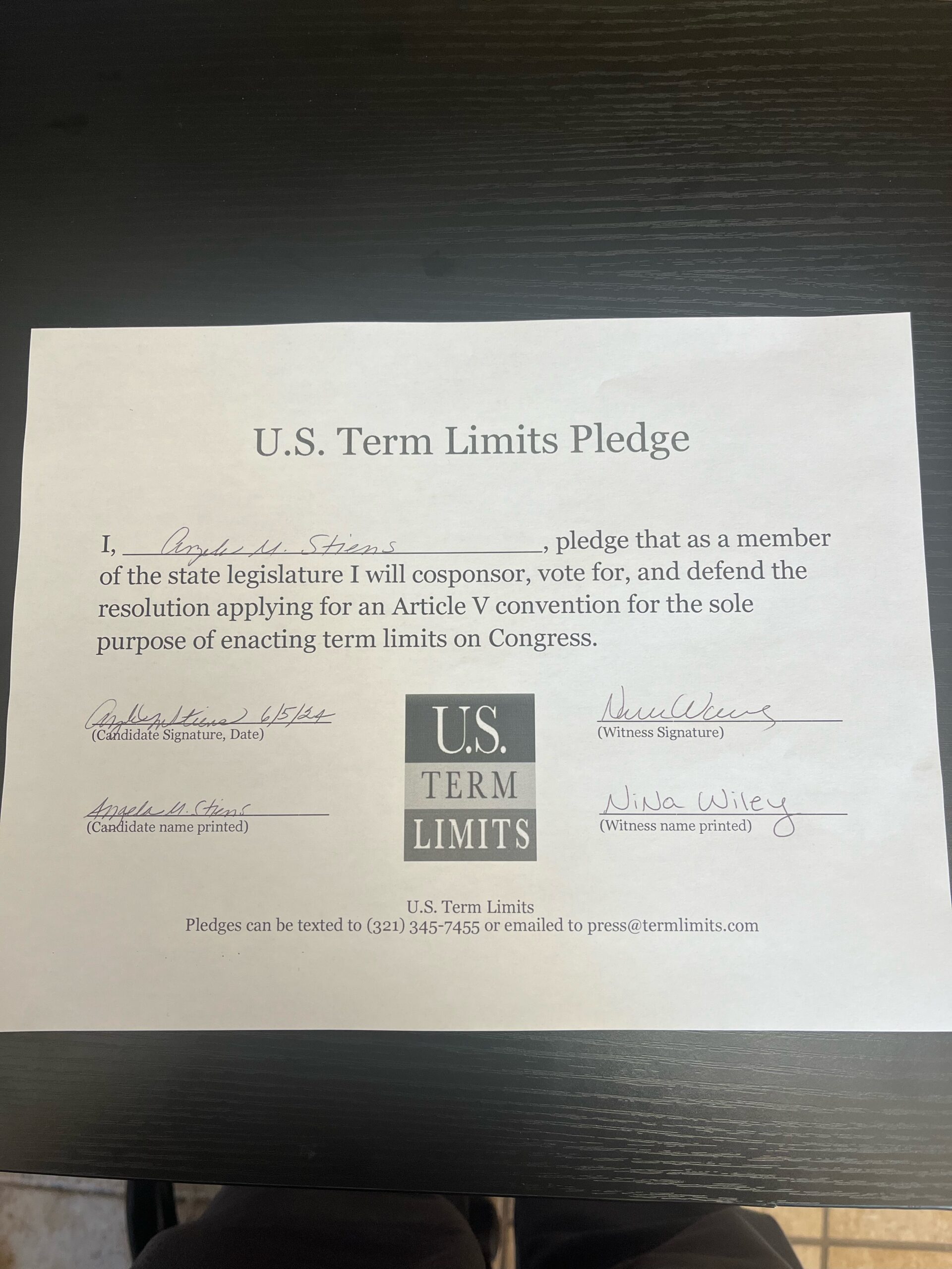Shawnee, KS —Kansas State Rep. Angela Stiens (District 39) was recently recognized for supporting Term Limits for Congress by signing the U.S. Term Limits Pledge, which states that “as a member of the state legislature, I will cosponsor, vote for, and defend the resolution applying for an Article V convention for the sole purpose of enacting term limits on Congress.”