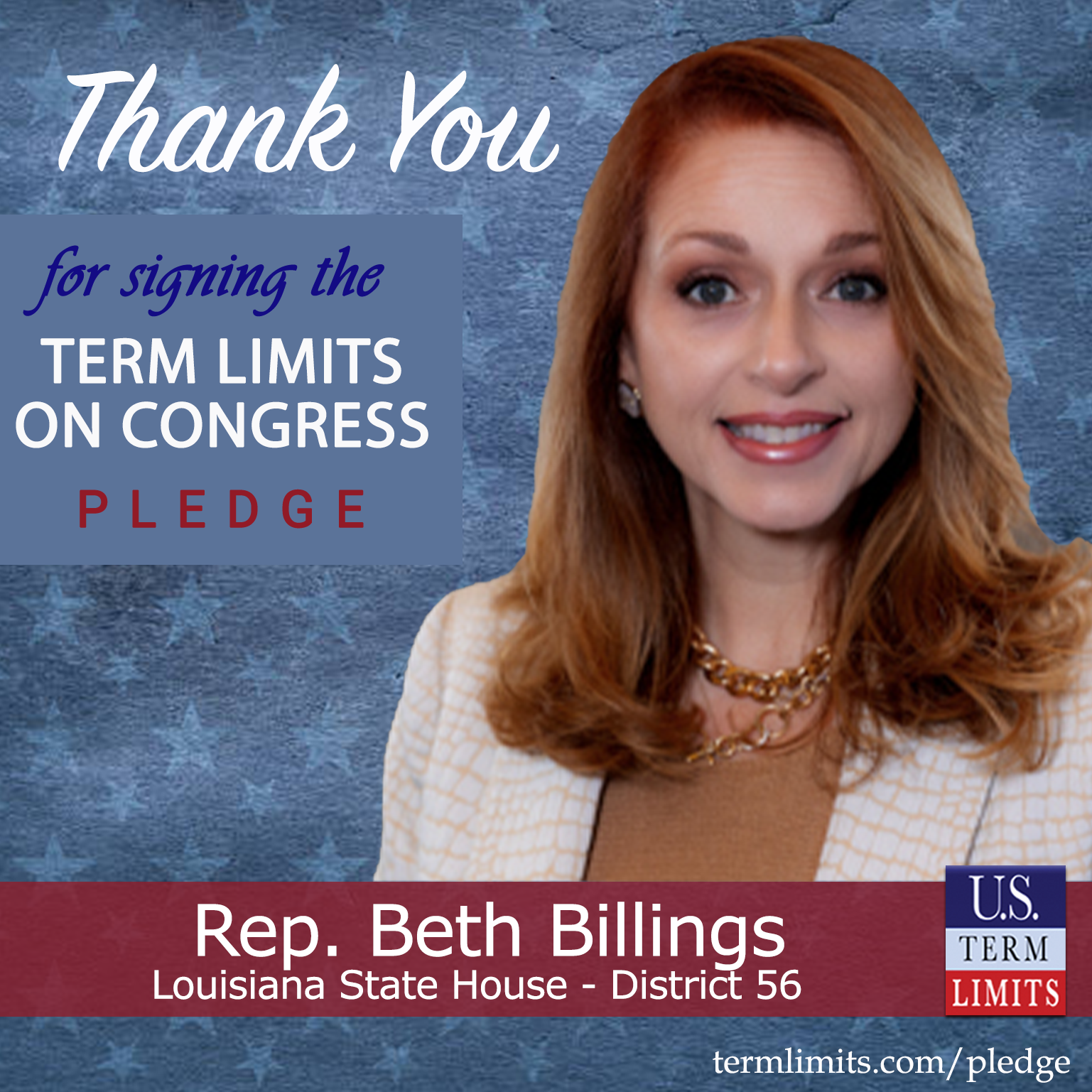 Destrehan, LA – U.S. Term Limits (USTL), the leader in the national, non-partisan movement to limit terms for elected officials, is gathering support from state lawmakers across the nation. Its mission is to get 34 states to apply for an amendment proposal convention specific to term limits on Congress. Louisiana state house Rep. Beth Billings (District 56), has committed support for term limits on Congress by signing the term limits convention pledge.