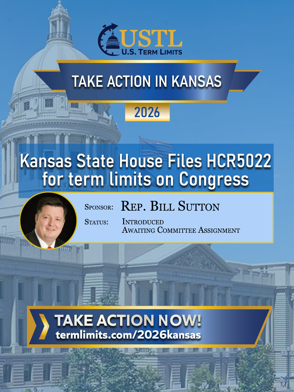 Topeka, KS – Rep.Bill Sutton (district 43) has filed House Concurrent Resolution 5022 (HCR5022) to add Kansas to the list of states calling on Congress to propose a congressional term limits amendment to the U.S. Constitution. Like the other state efforts, HCR5022 makes it clear to Congress that if they fail, Kansas and its fellow states will propose the amendment themselves. The effort is being spearheaded by the nonpartisan, nonprofit, U.S. Term Limits (USTL).