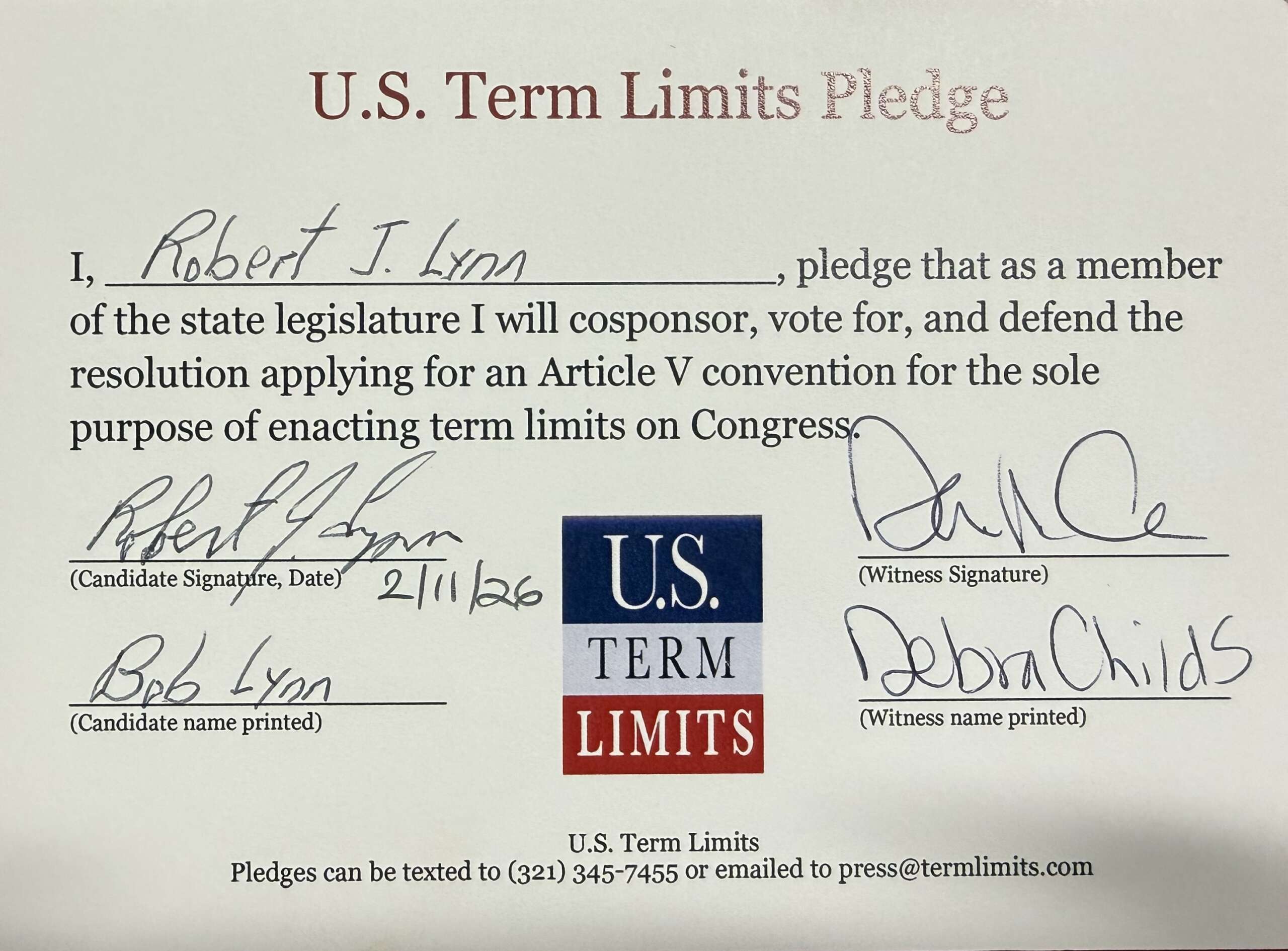 The U.S. Term Limits pledge is provided to candidates and members of state legislatures. It reads, “I pledge that, as a member of the state legislature, I will cosponsor, vote for, and defend the resolution applying for an Article V convention for the sole purpose of enacting term limits on Congress.”