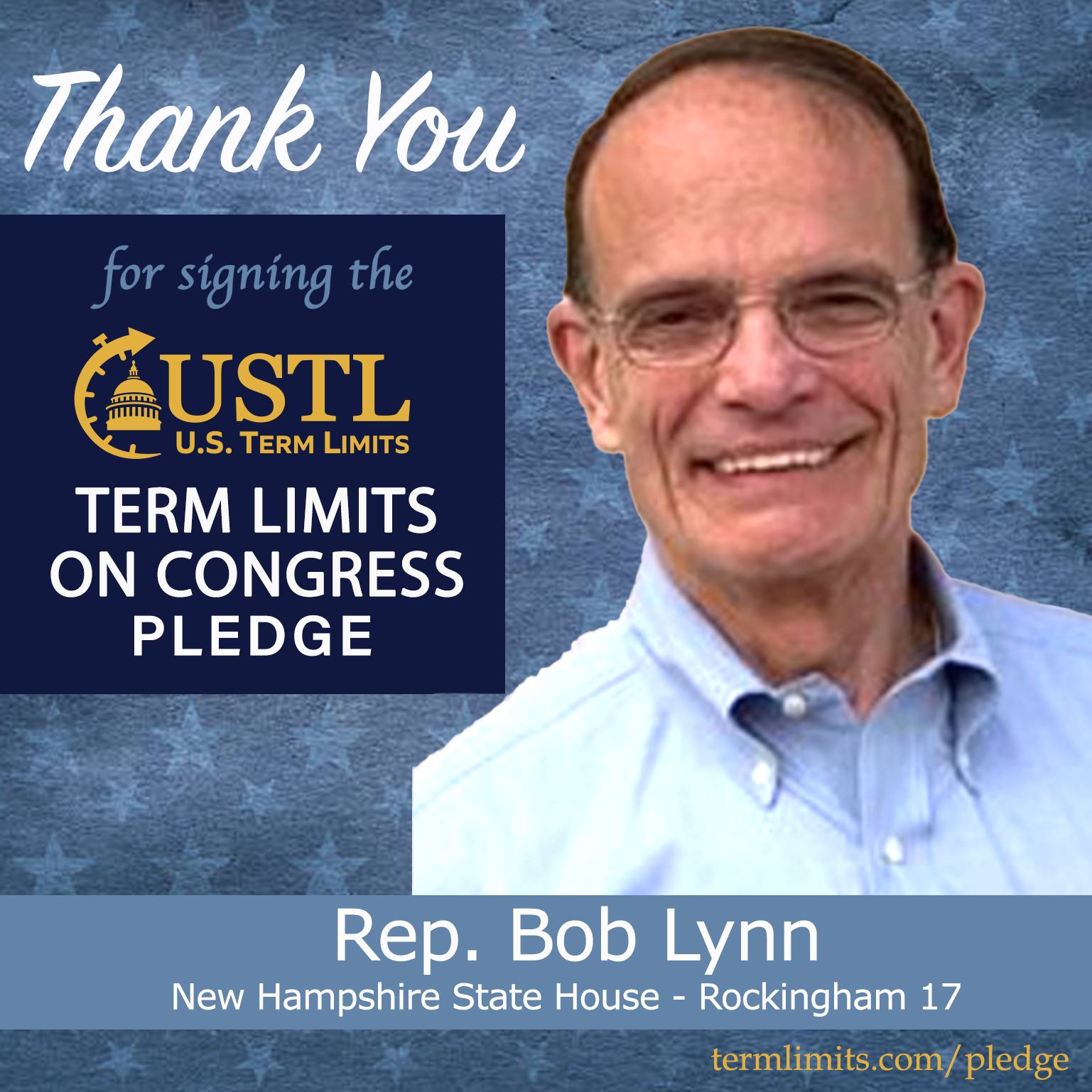Windham, NH – U.S. Term Limits (USTL), the leader in the national, non-partisan movement to limit terms for elected officials, is gathering support from state lawmakers across the nation. Its mission is to get 34 states to apply for an amendment proposal convention specific to term limits on Congress. New Hampshire state house Rep. Bob. Lynn (Rockingham 17), has committed support for term limits on Congress by signing the term limits convention pledge.