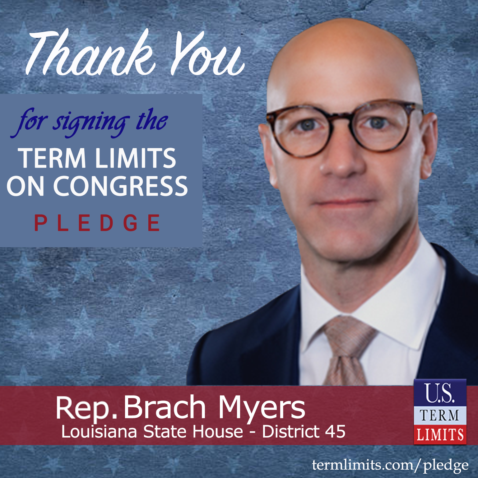 Lafayette, LA – U.S. Term Limits (USTL), the leader in the national, non-partisan movement to limit terms for elected officials, is gathering support from state lawmakers across the nation. Its mission is to get 34 states to apply for an amendment proposal convention specific to term limits on Congress. Louisiana state house Rep. Brach Myers (District 45), has committed support for term limits on Congress by signing the term limits convention pledge.