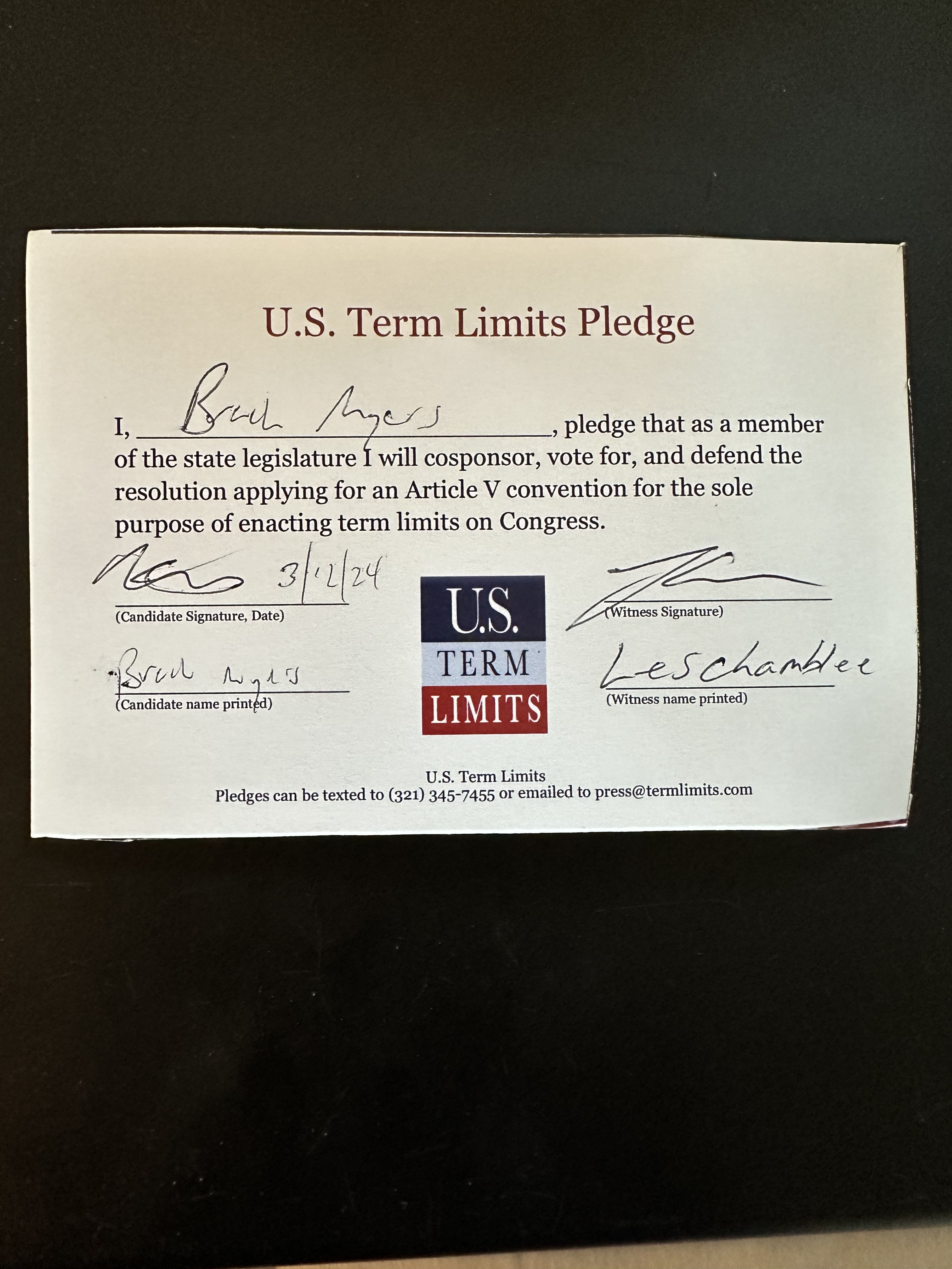 USTL President, Philip Blumel, commented on Myers’s pledge saying, “Brach’s strong support of term limits shows that there are individuals who are willing to listen to the majority of voters who want term limits. America needs a Congress that will be served by citizen legislators, not career politicians.”