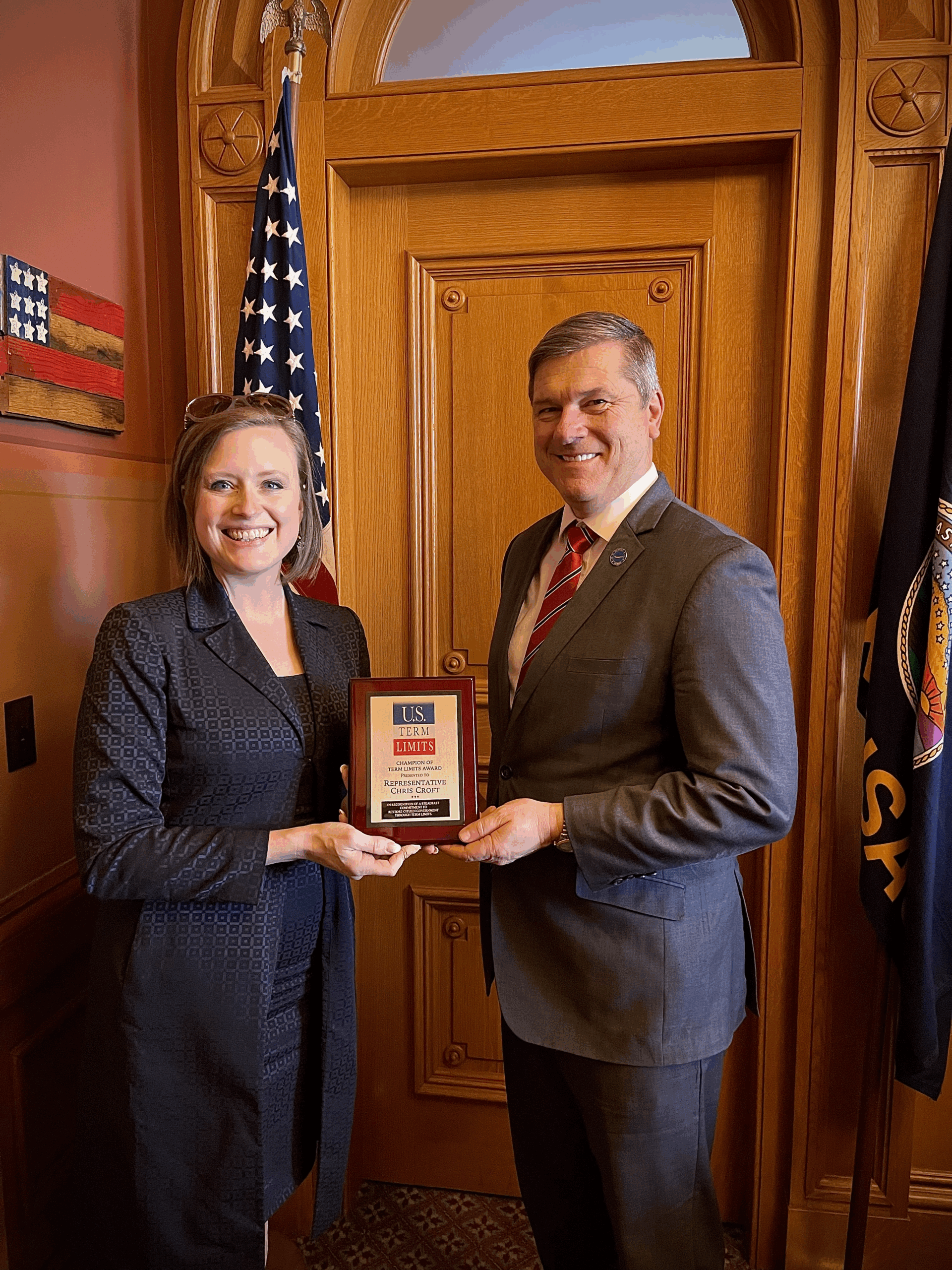 U.S. Term Limits presented Representative Croft with the “Champion of Term Limits” plaque, which reads, “In recognition of a steadfast commitment to restore citizen government through term limits.” The U.S. Term Limits Article V convention application is limited to proposing an amendment to set a limit on the number of terms that a person may be elected as a member of the U.S. House and Senate. The Article V convention application does not specify the number of terms as that will be determined by the commissioners appointed to the convention by the state legislatures.