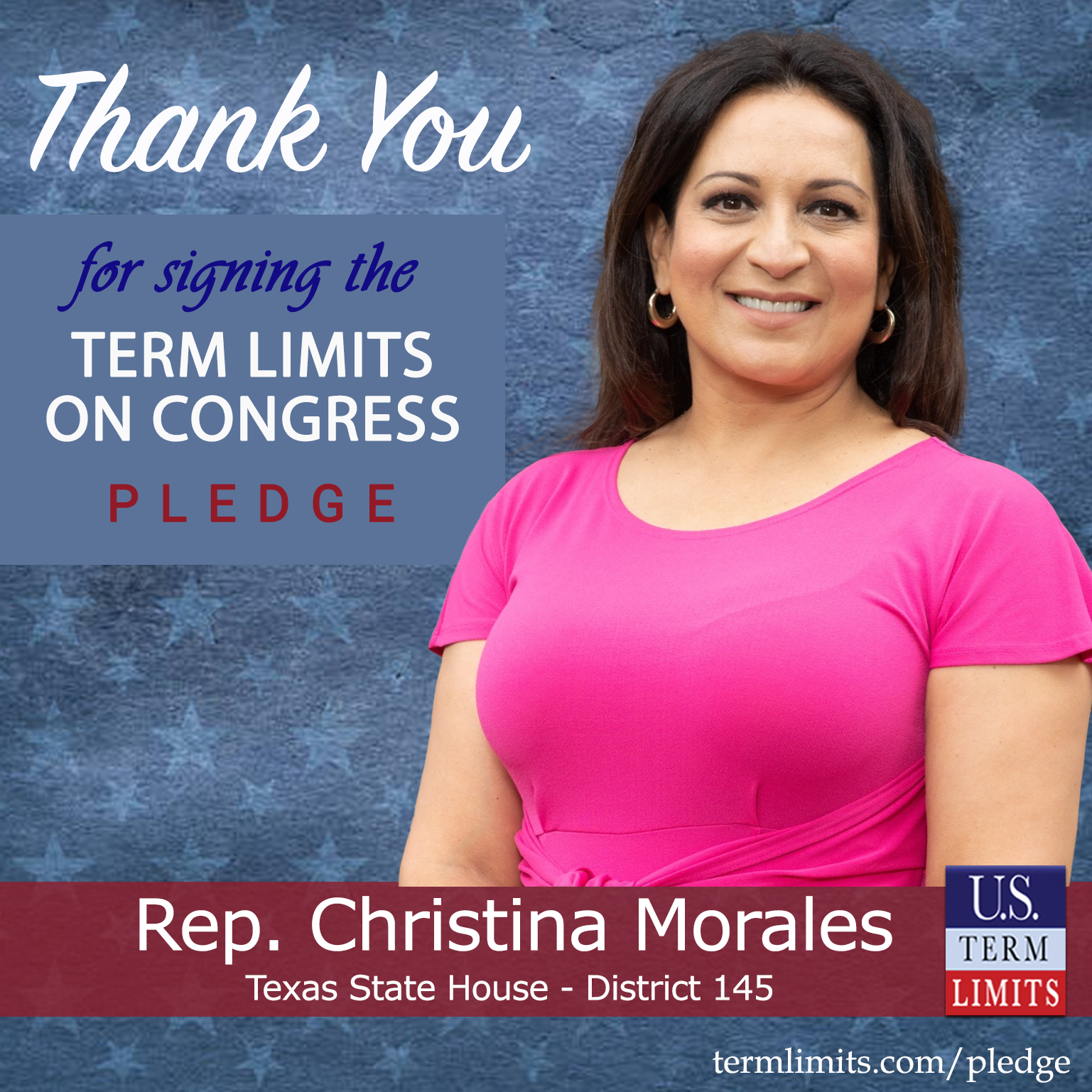 Houston, TX – U.S. Term Limits (USTL), the leader in the national, non-partisan movement to limit terms for elected officials, is gathering support from state lawmakers across the nation. Its mission is to get 34 states to apply for an amendment proposal convention specific to term limits on Congress. 2025 Texas state house Rep. Christina Morales (district 145), has committed support for term limits on Congress by signing the term limits convention pledge.