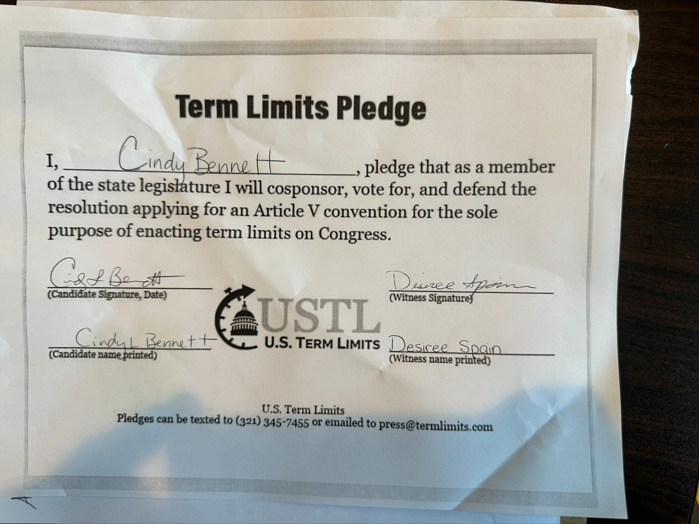 Rep. Cindy Bennett Pledges to Support Congressional Term Limits