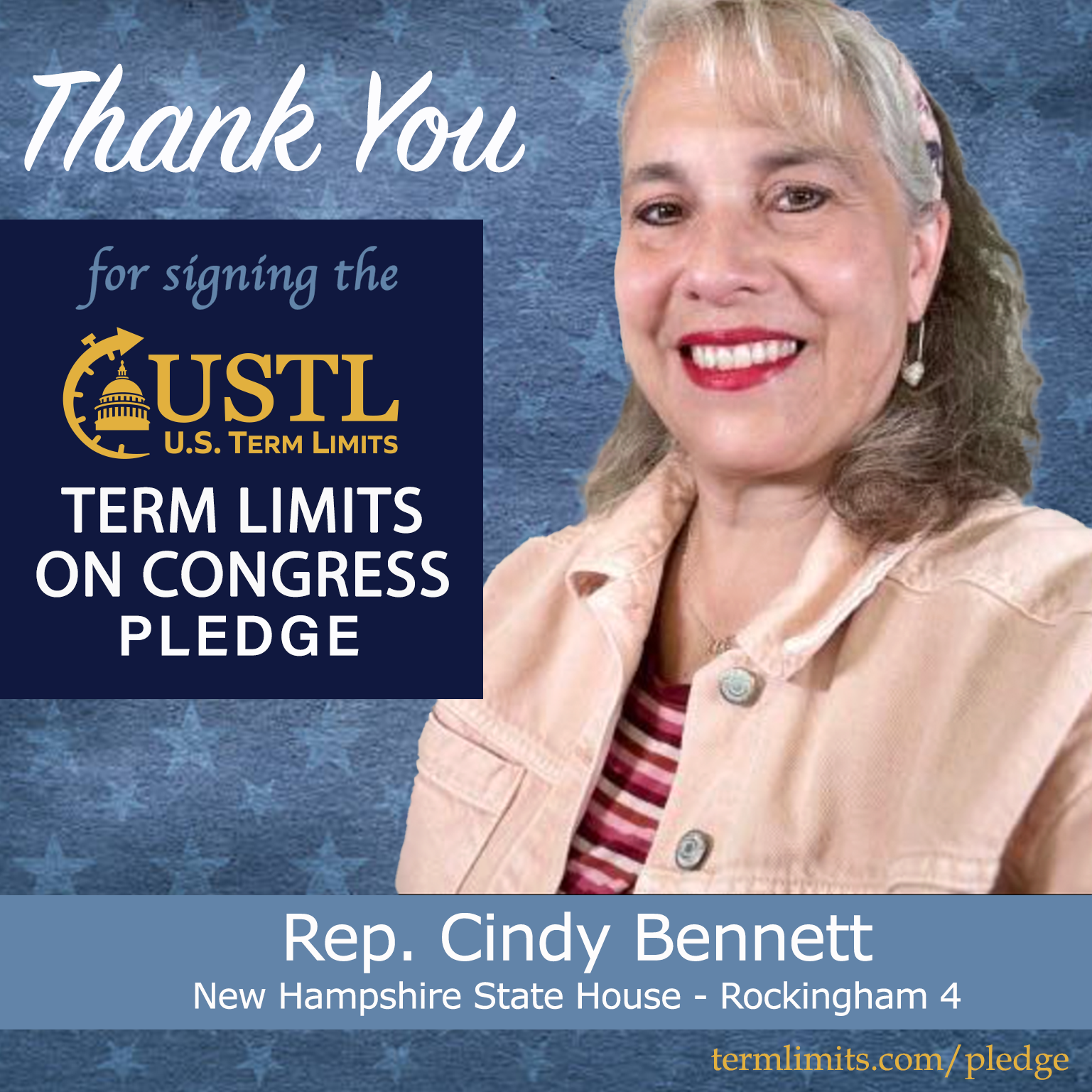 Raymond, NH – U.S. Term Limits (USTL), the leader in the national, non-partisan movement to limit terms for elected officials, is gathering support from state lawmakers across the nation. Its mission is to get 34 states to apply for an amendment proposal convention specific to term limits on Congress. New Hampshire state house Rep. Cindy Bennett (Rockingham 4), has committed support for term limits on Congress by signing the term limits convention pledge.