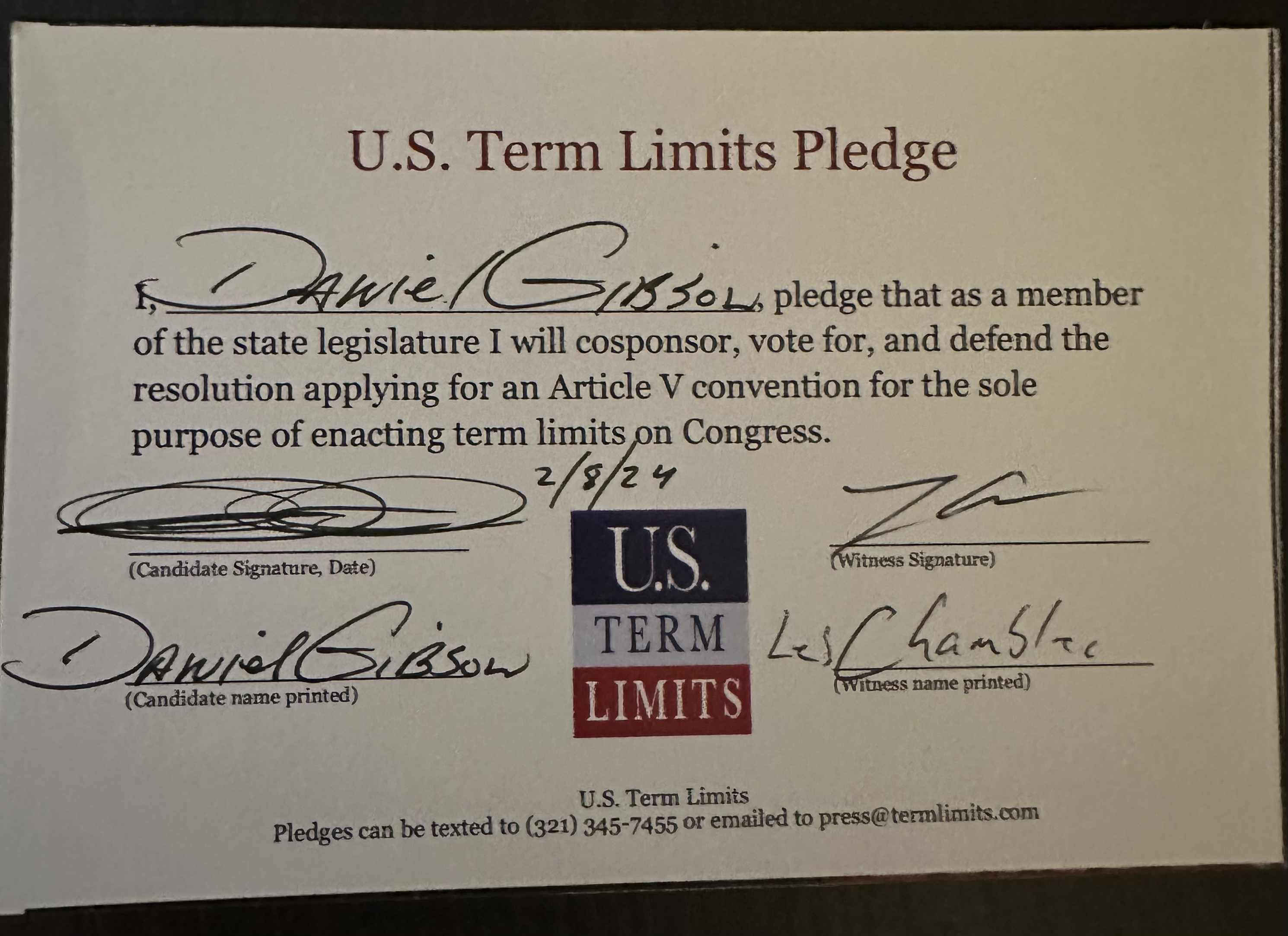 Rep. Dan Gibson Pledges to Support Congressional Term Limits