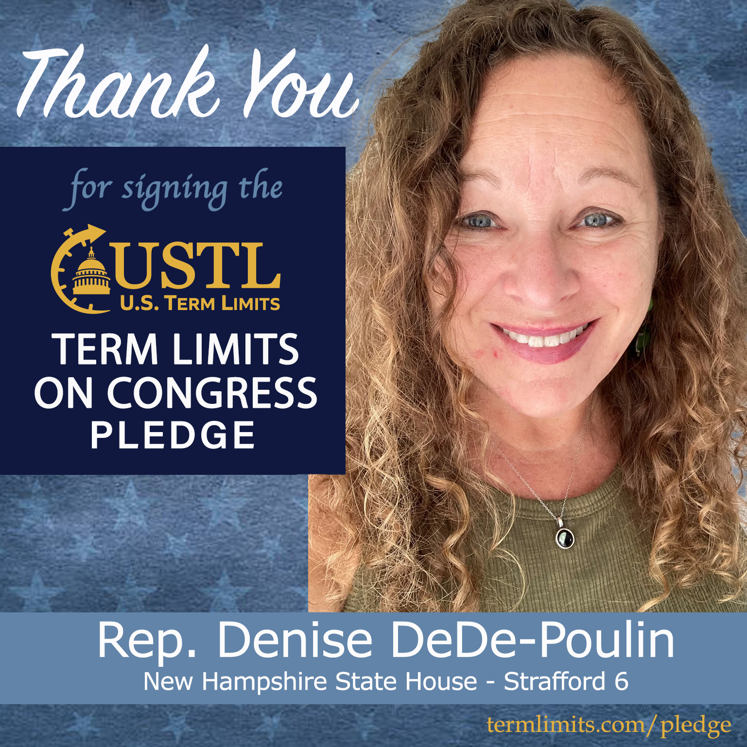 Rochester, NH – U.S. Term Limits (USTL), the leader in the national, non-partisan movement to limit terms for elected officials, is gathering support from state lawmakers across the nation. Its mission is to get 34 states to apply for an amendment proposal convention specific to term limits on Congress. New Hampshire state house Rep. Denise DeDe-Poulin (Strafford 6), has committed support for term limits on Congress by signing the term limits convention pledge.