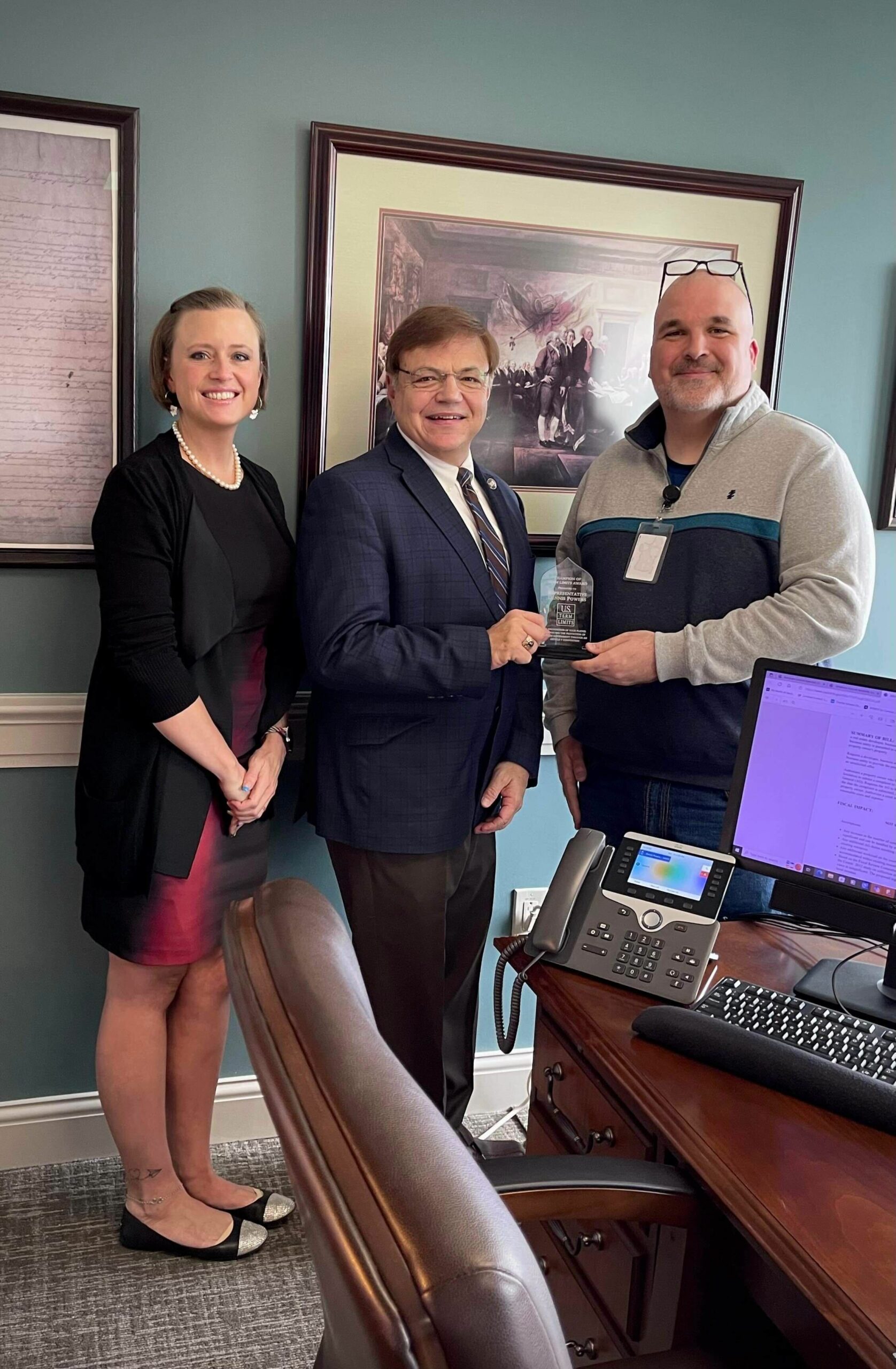 Members of the U.S. Term Limits team, presented the distinction to Rep. Powers. The “Champion of Term Limits” plaque reads, “In recognition of your pledge supporting the protection of citizen government through an Article V convention.” Powers pledged to support house joint resolution 5 (HJR5) which is scheduled for a house floor vote next week. The convention bill does not set the specific length of term limits as it is meant to starts a discussion among the states on what the ideal term limits of congressmembers should be.