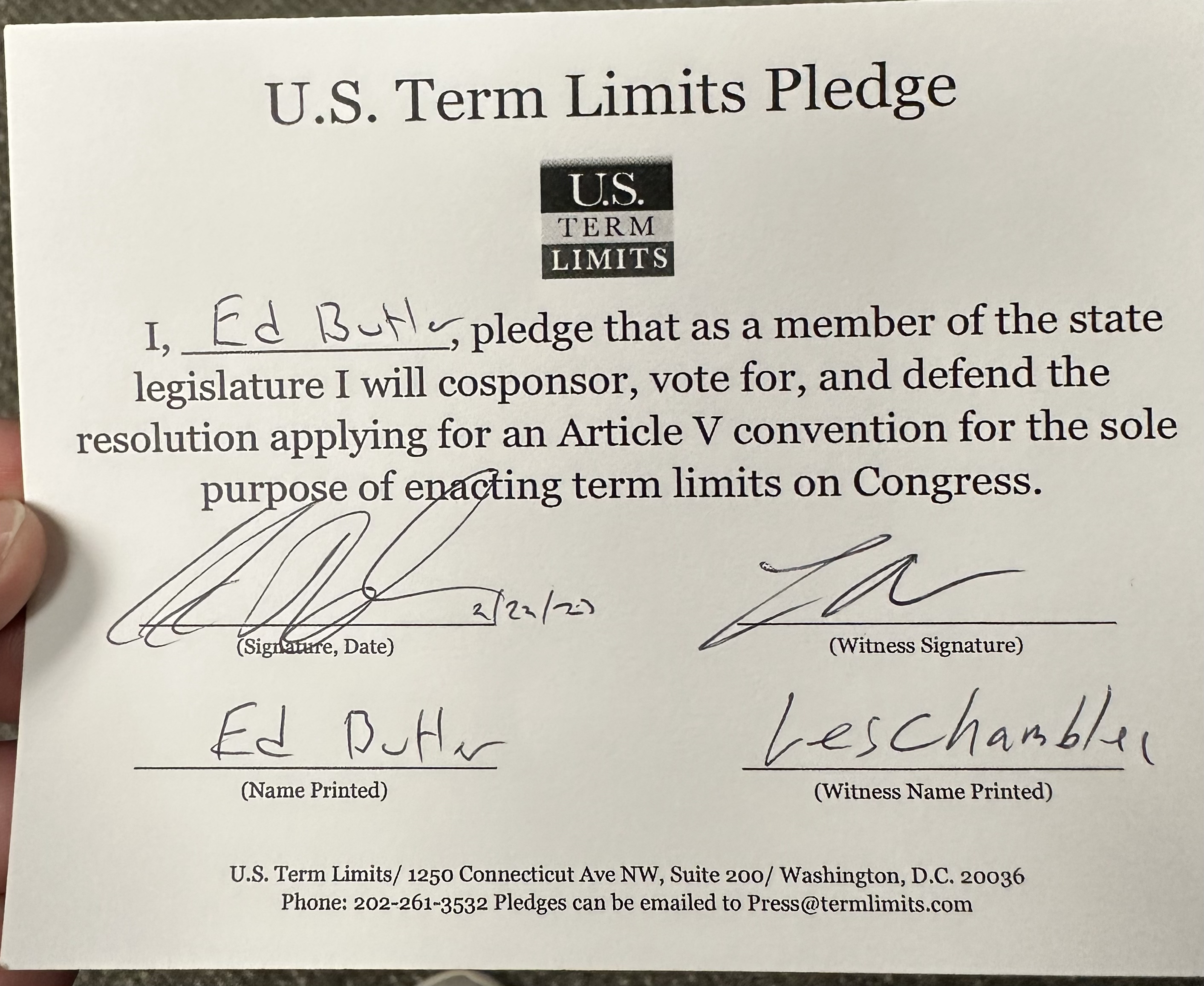 Nashville, TN —Tennessee State Representative Ed Butler (district 41) was recently recognized for his efforts to support a Term Limits Amendment on Congress. This amendment was created by the U.S. Term Limits Pledge, which states that Ed Butler will work to cosponsor, vote for, and defend the resolution for an Article V convention, for the sole purpose of enforcing term limits on Congress.