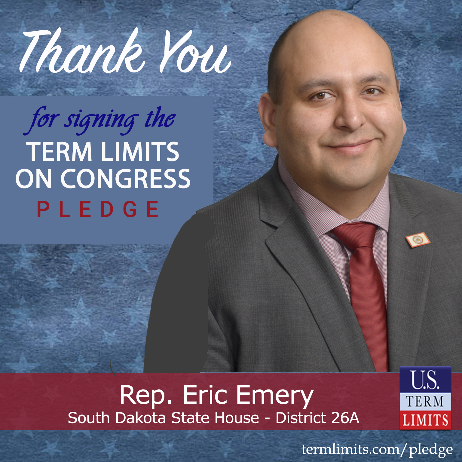 Chamberlain, SD – U.S. Term Limits (USTL), the leader in the national, non-partisan movement to limit terms for elected officials, is gathering support from state lawmakers across the nation. Its mission is to get 34 states to apply for an amendment proposal convention specific to term limits on Congress. 2025 South Dakota state house Rep. Eric Emery (district 26A), has committed support for term limits on Congress by signing the term limits convention pledge.