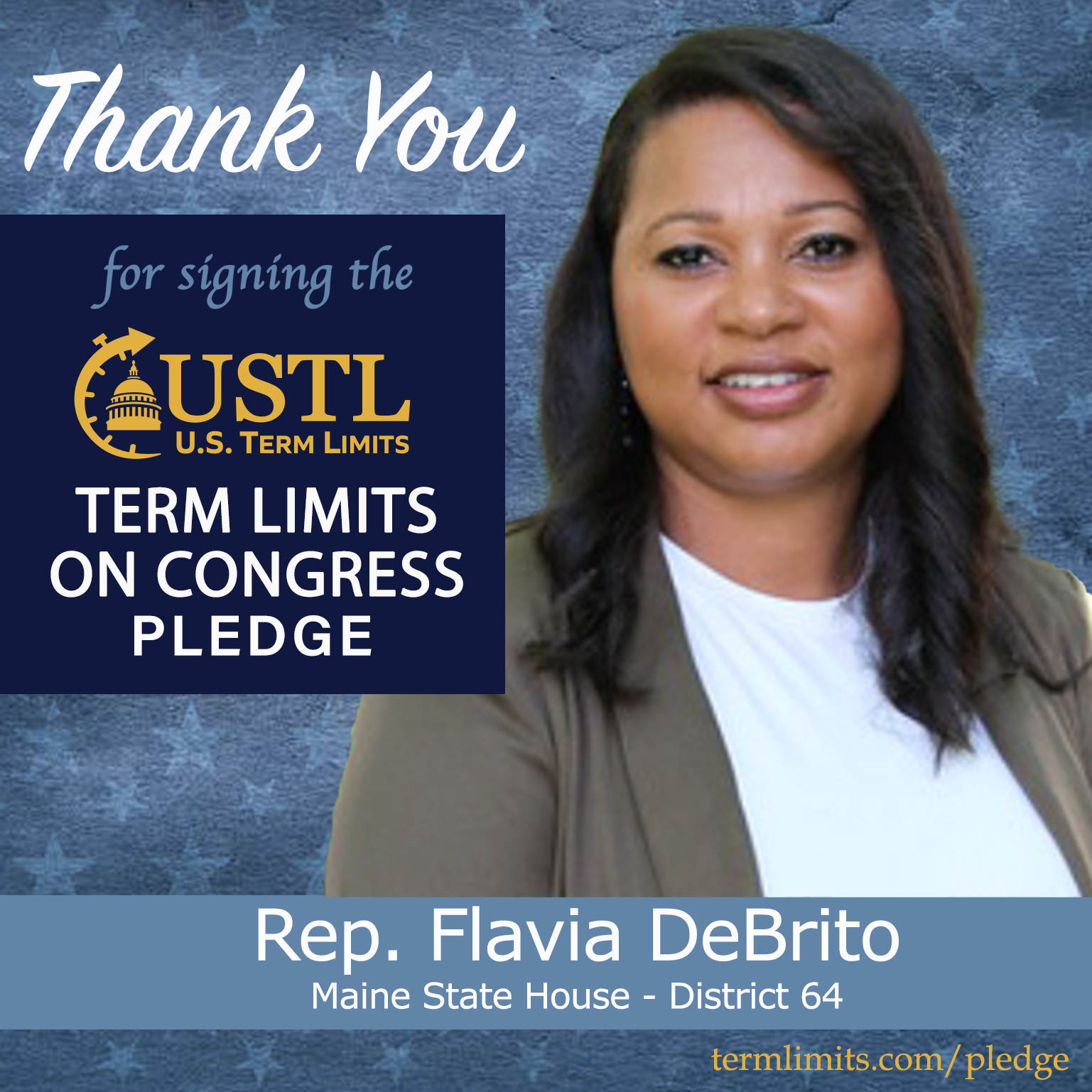 Waterville, ME – U.S. Term Limits (USTL), the leader in the national, non-partisan movement to limit terms for elected officials, is gathering support from state lawmakers across the nation. Its mission is to get 34 states to apply for an amendment proposal convention specific to term limits on Congress. 2026 Maine state house Rep. Flavia DeBrito (district 64), has committed support for term limits on Congress by signing the term limits convention pledge.