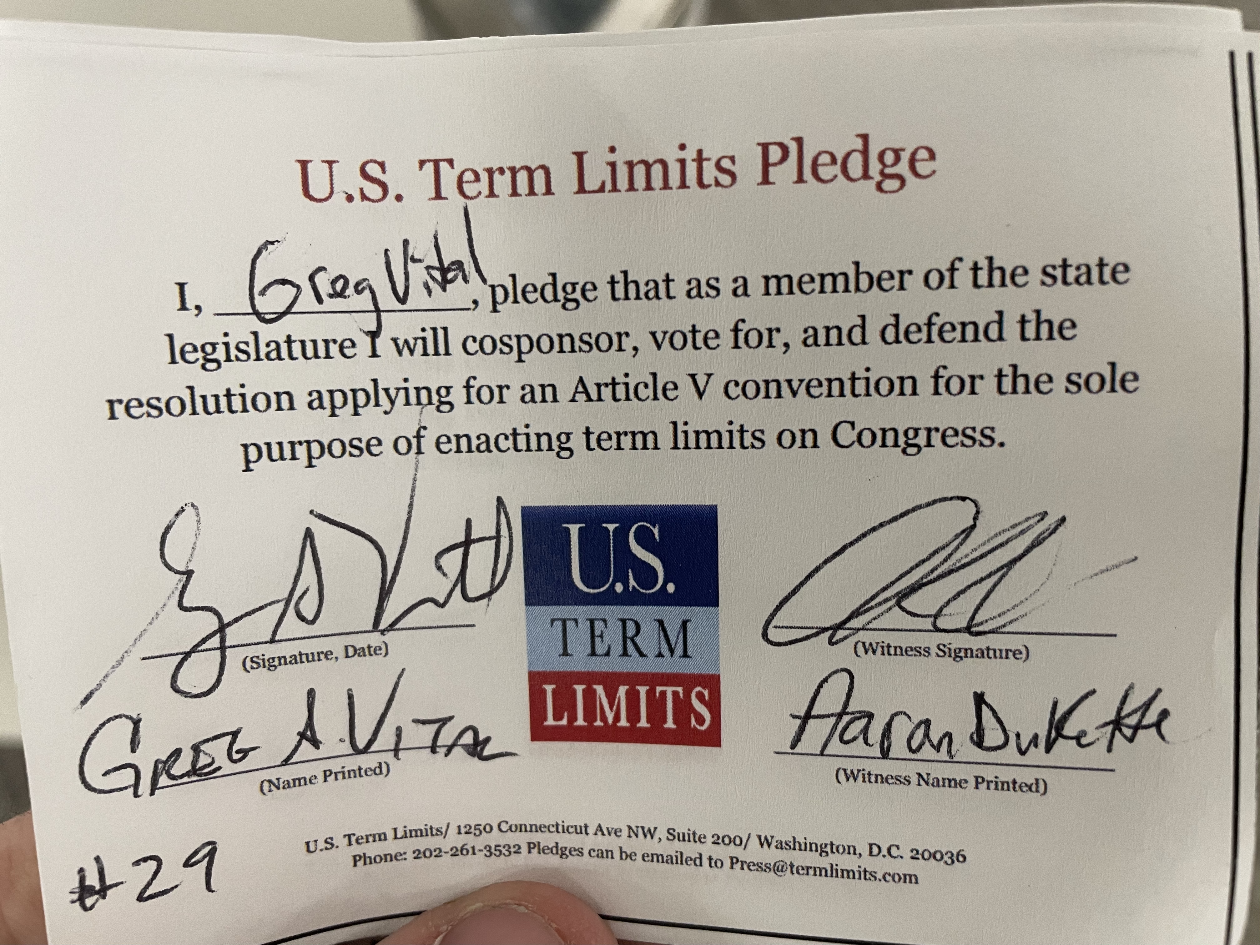 Nashville, TN —Tennessee State Representative Greg Vital (district 29) was recently recognized for his efforts to support a Term Limits Amendment on Congress. This amendment was created by the U.S. Term Limits Pledge, which states that Greg Vital will work to cosponsor, vote for, and defend the resolution for an Article V convention, for the sole purpose of enforcing term limits on Congress.
