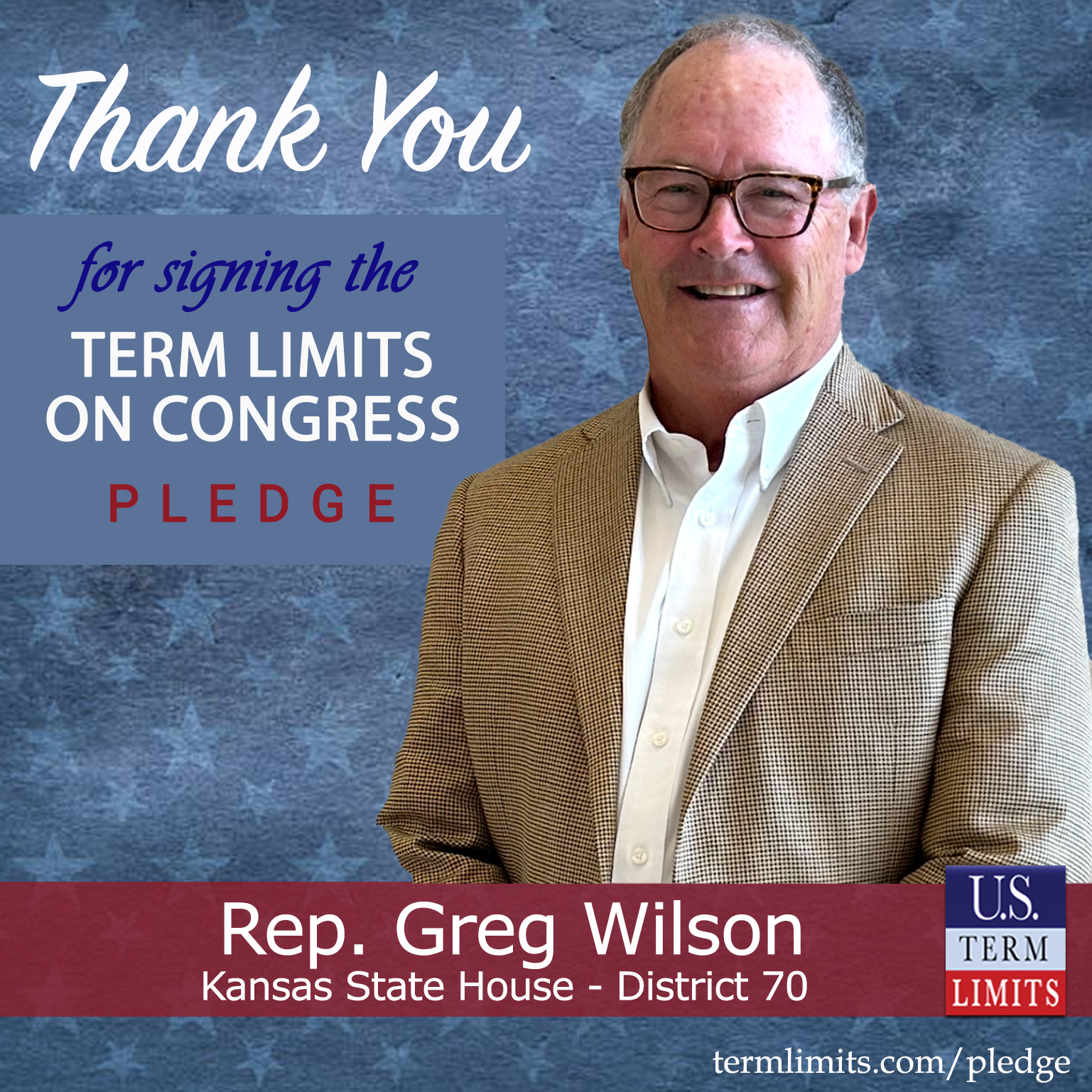 Longford, KS – U.S. Term Limits (USTL), the leader in the national, non-partisan movement to limit terms for elected officials, is gathering support from state lawmakers across the nation. Its mission is to get 34 states to apply for an amendment proposal convention specific to term limits on Congress. 2025 Kansas state Rep. Greg Wilson (district 70), has committed support for term limits on Congress by signing the term limits convention pledge.