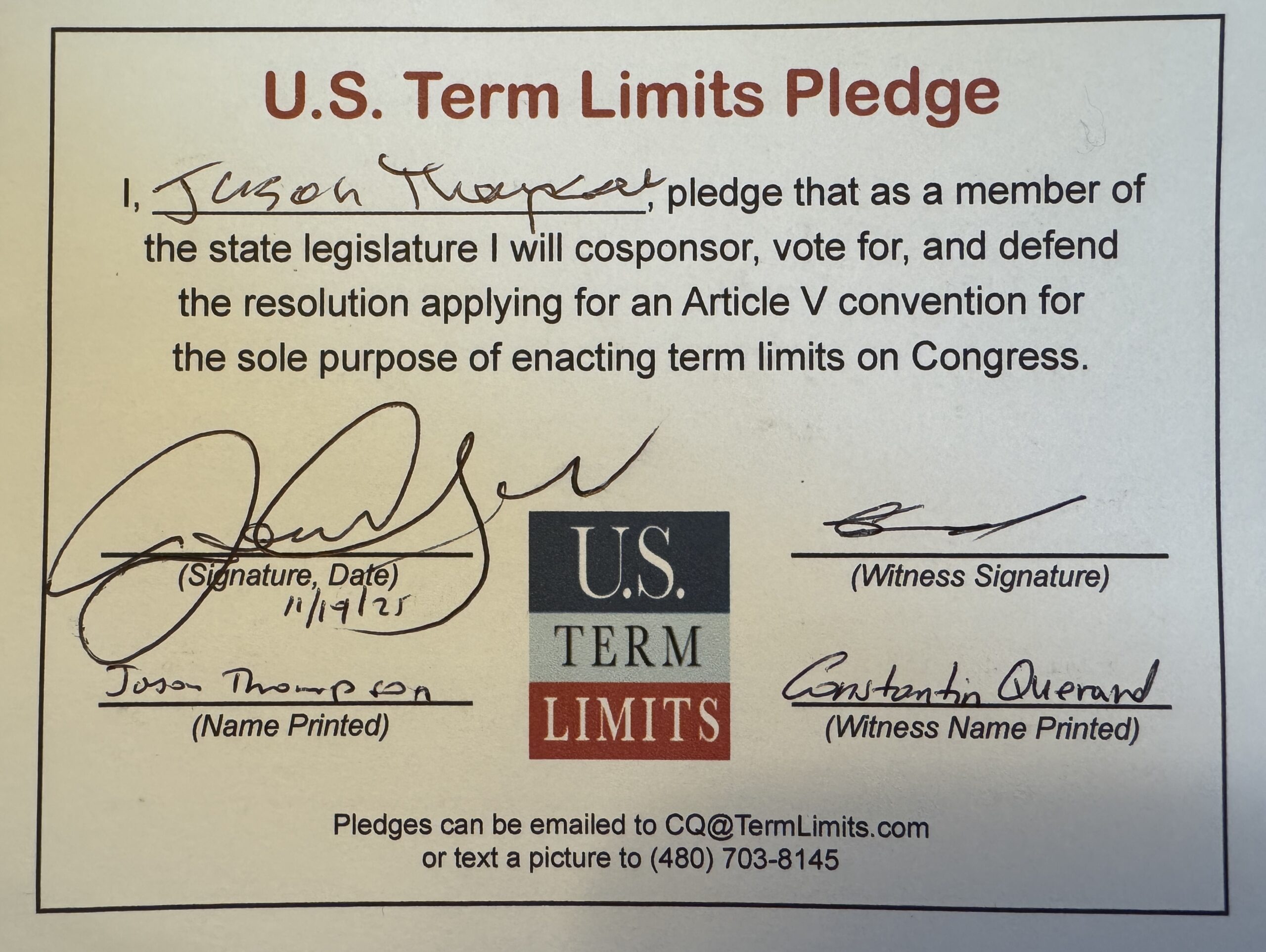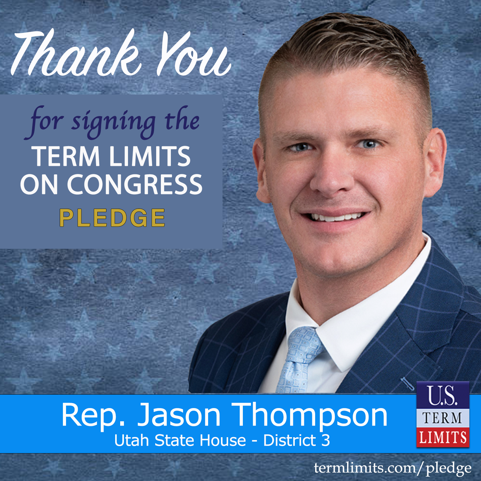 Salt Lake City, UT – U.S. Term Limits (USTL), the leader in the national, non-partisan movement to limit terms for elected officials, is gathering support from state lawmakers across the nation. Its mission is to get 34 states to apply for an amendment proposal convention specific to term limits on Congress. 2025 Utah state Rep. Jason Thompson (district 3), has committed support for term limits on Congress by signing the term limits convention pledge.