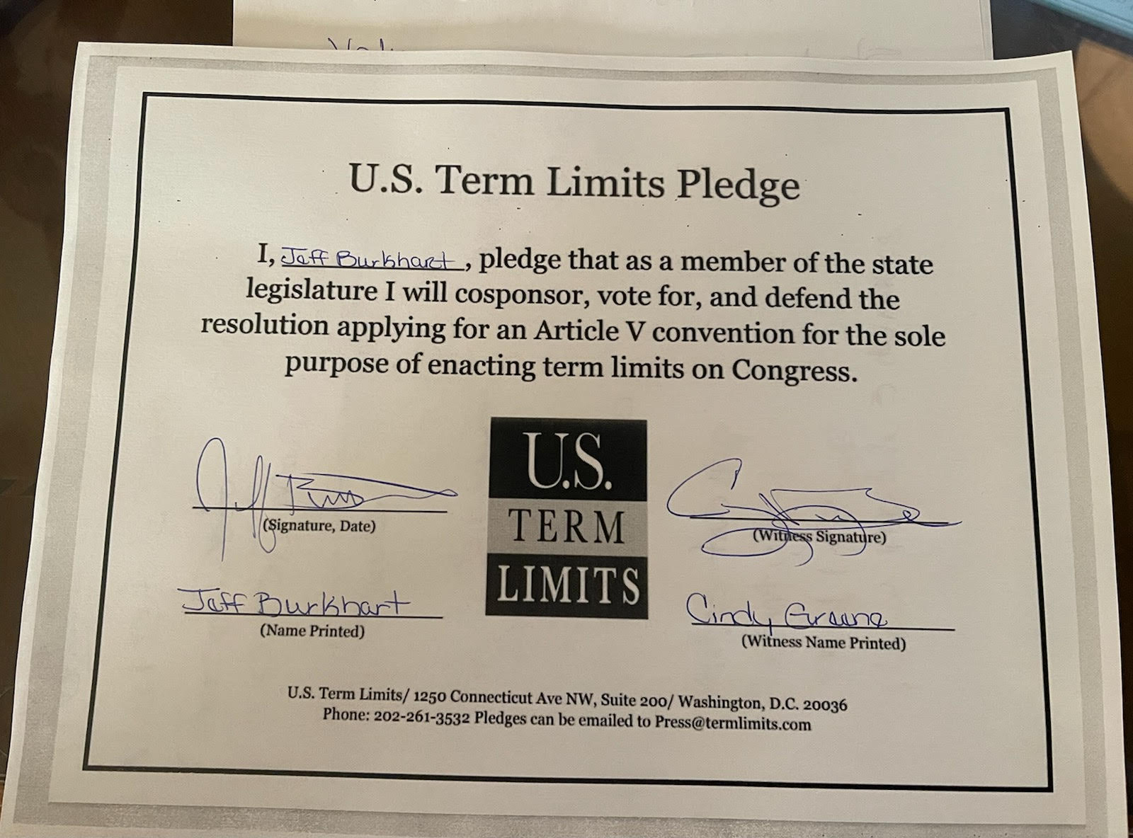 Nashville, TN —Tennessee State Representative Jeff Burkhart (district 75) was recently recognized for his efforts to support a Term Limits Amendment on Congress. This amendment was created by the U.S. Term Limits Pledge, which states that Jeff Burkhart will work to cosponsor, vote for, and defend the resolution for an Article V convention, for the sole purpose of enforcing term limits on Congress.