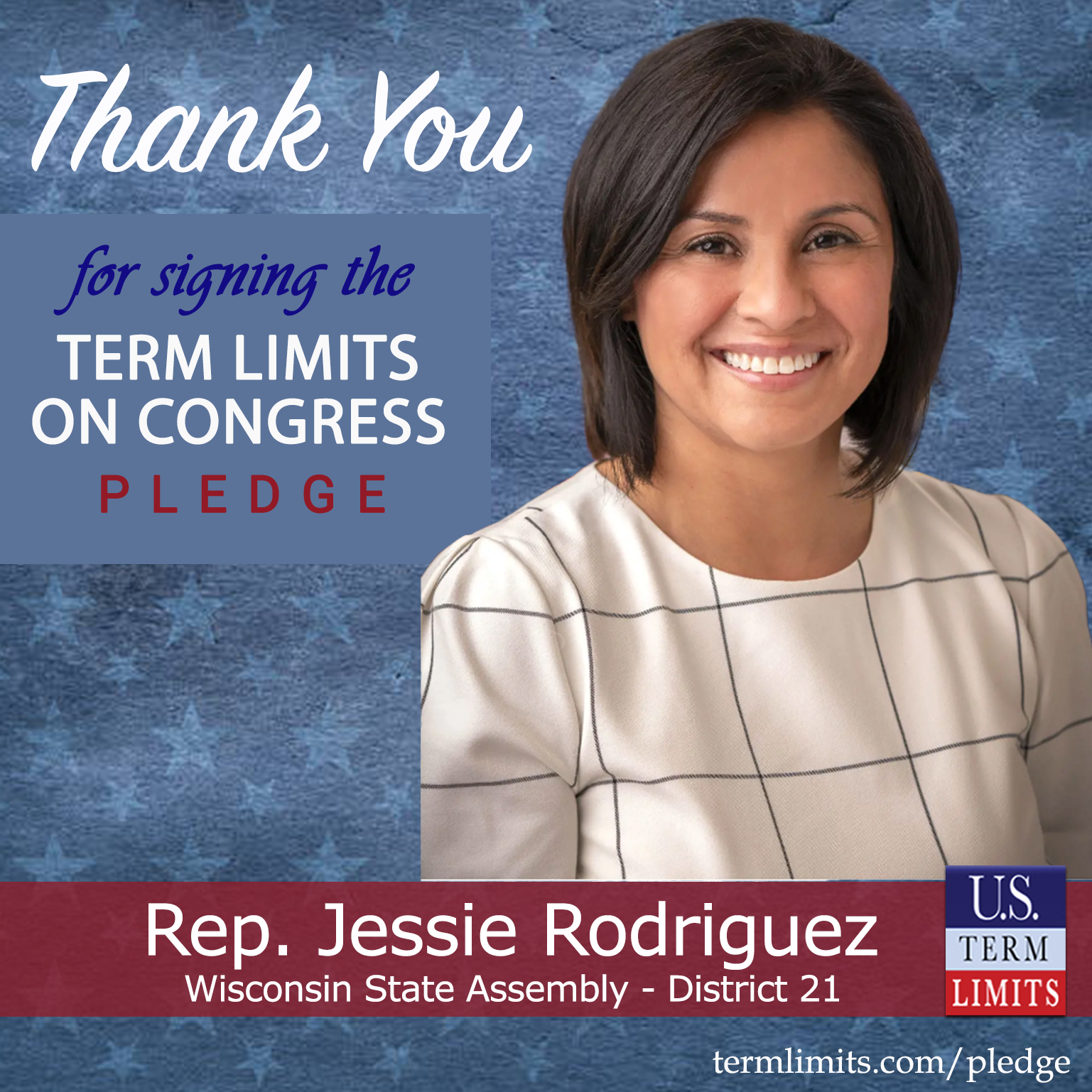 “I am thrilled that Jessie has signed the pledge supporting term limits on Congress. We are gaining momentum in Wisconsin so that we can join the growing number of states supporting Congressional term limits. Jessie recognizes the importance of fixing Washington,” said Jason Church, state chair for U. S. Term Limits.