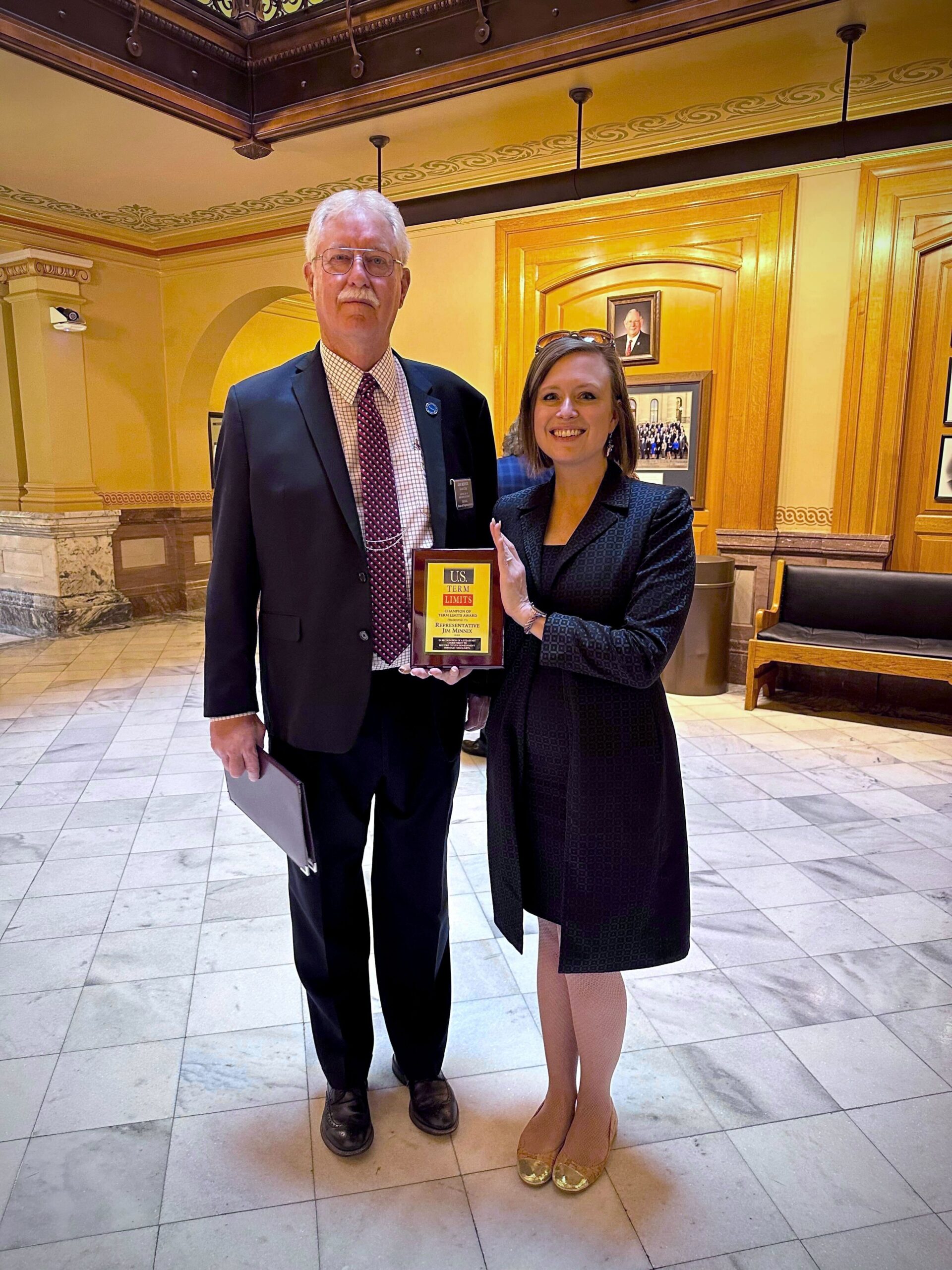 Shanna Chamblee of U.S. Term Limits presented Rep. Minnix with the “Champion of Term Limits” plaque, which reads, “In recognition of a steadfast commitment to restore citizen government through term limits.” The U.S. Term Limits Article V convention application is limited to proposing an amendment to set a limit on the number of terms that a person may be elected as a member of the U.S. House and Senate. The Article V convention application does not specify the number of terms as that will be determined by the commissioners appointed to the convention by the state legislatures.